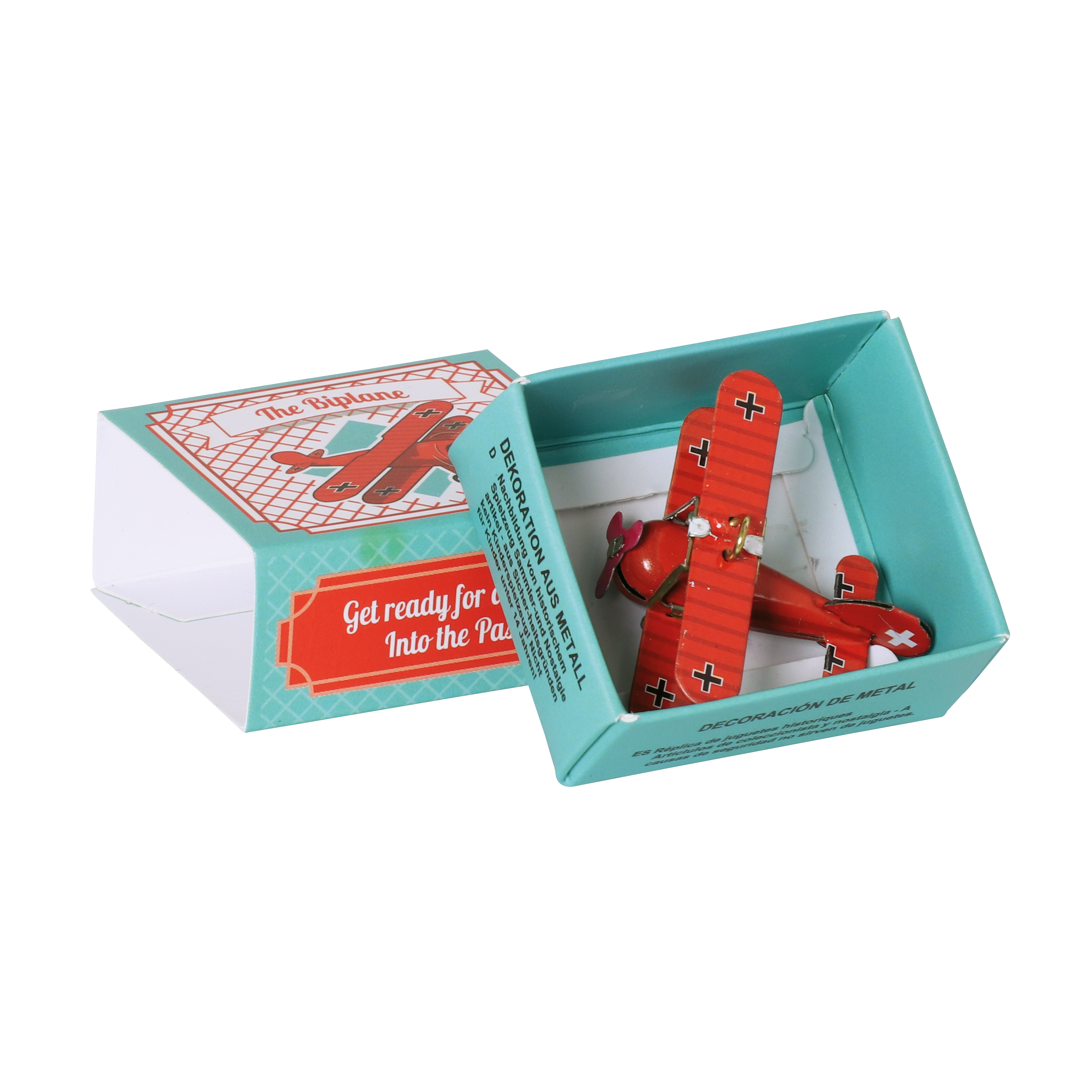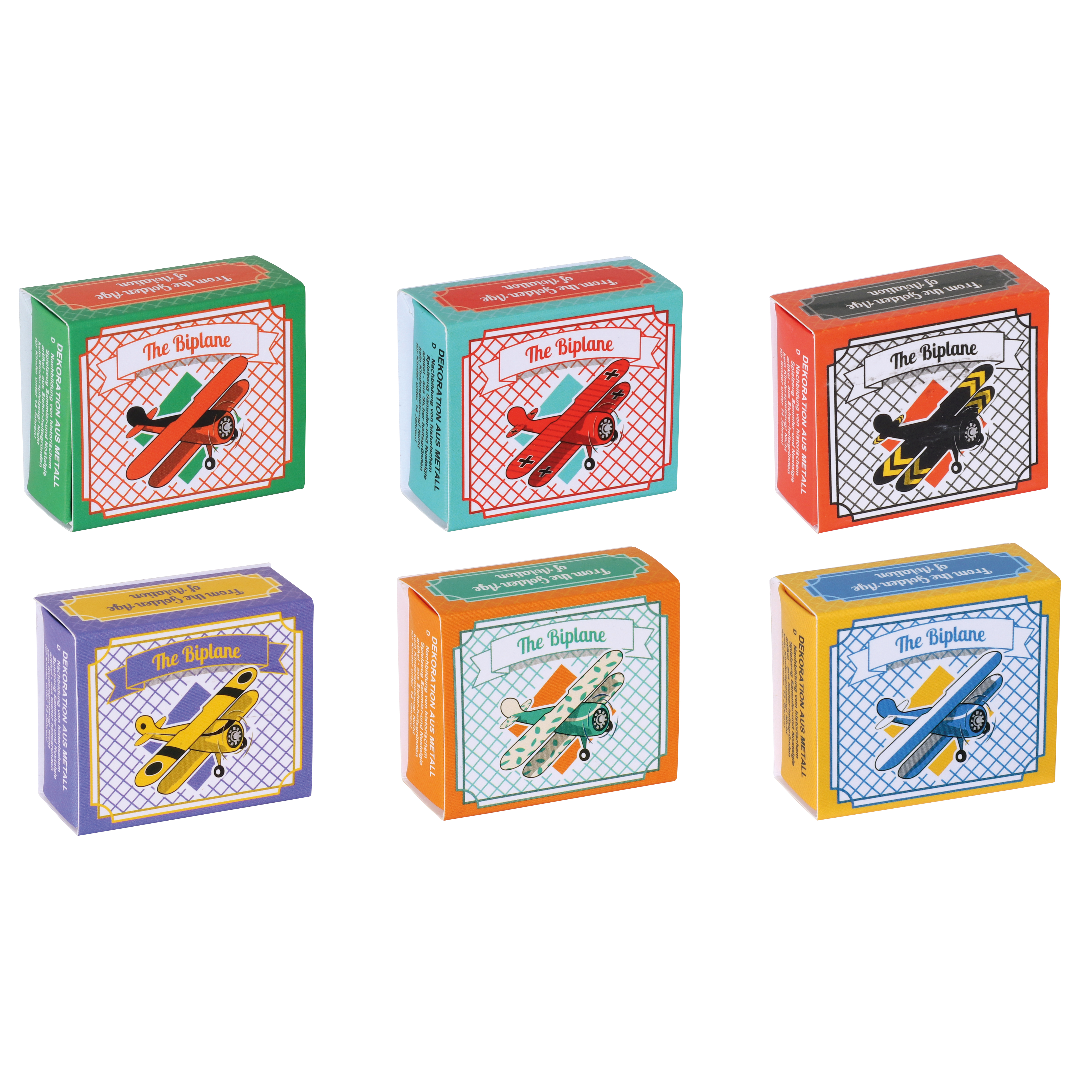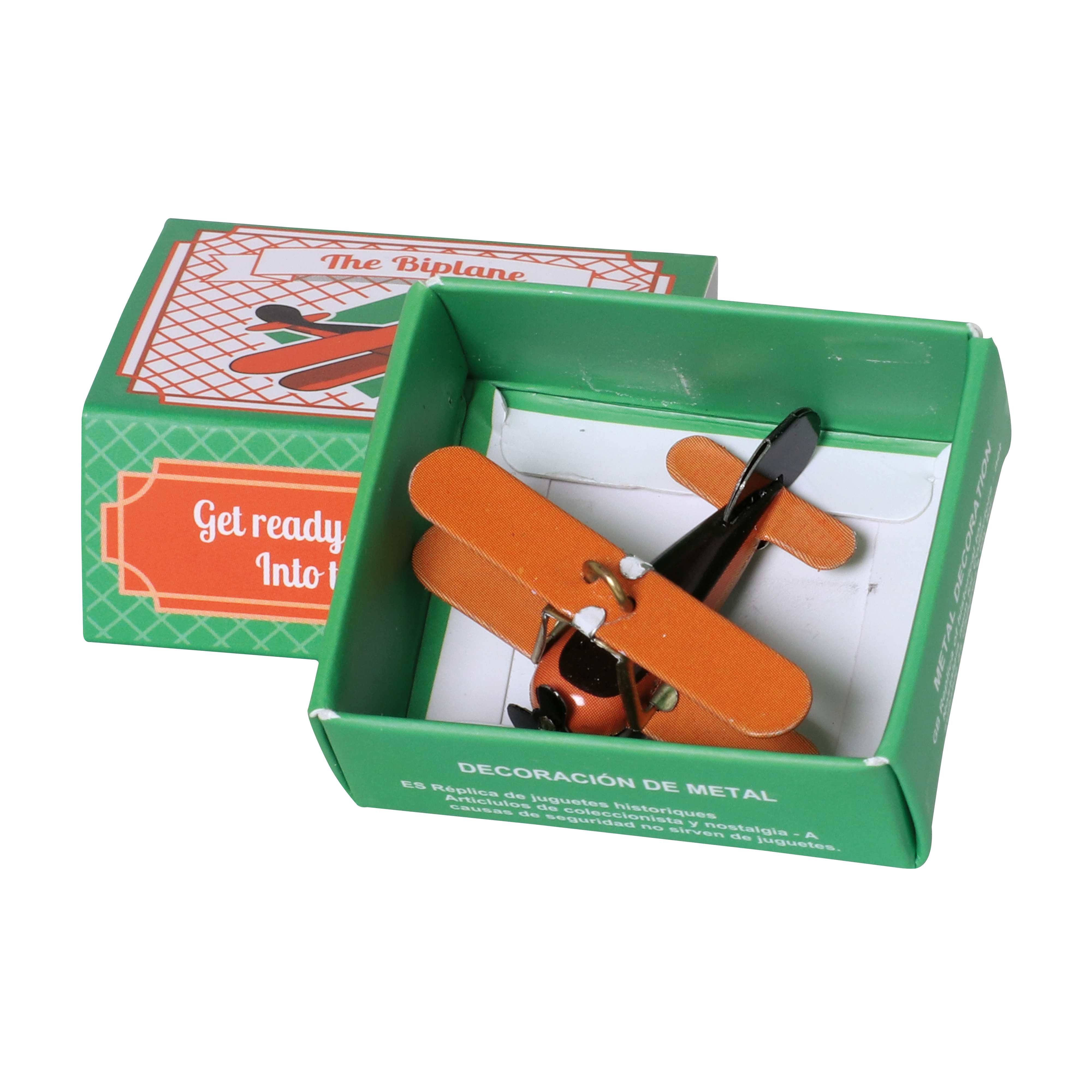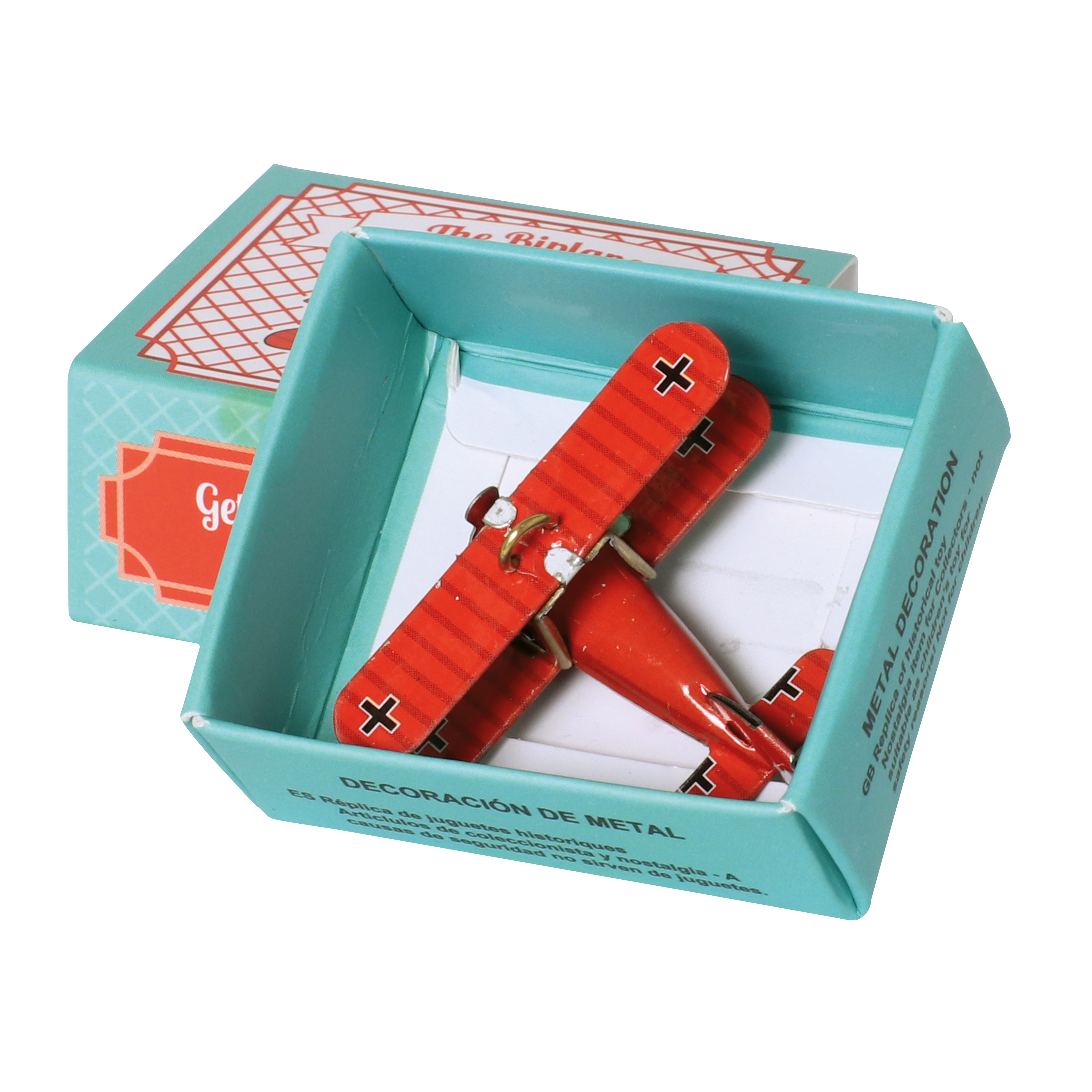 Nostalgische Dekoration aus Metall. Die liebevoll gestalteten Doppeldecker aus Metall sind eine schöne Deko-Idee, nicht nur für Flugzeug-Fans. Verschiedene Designs sortiert, je in Geschenkverpackung.
