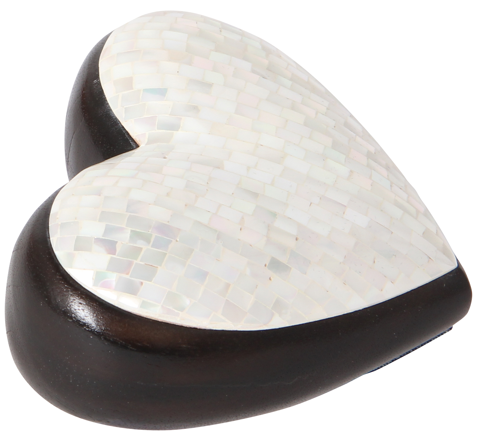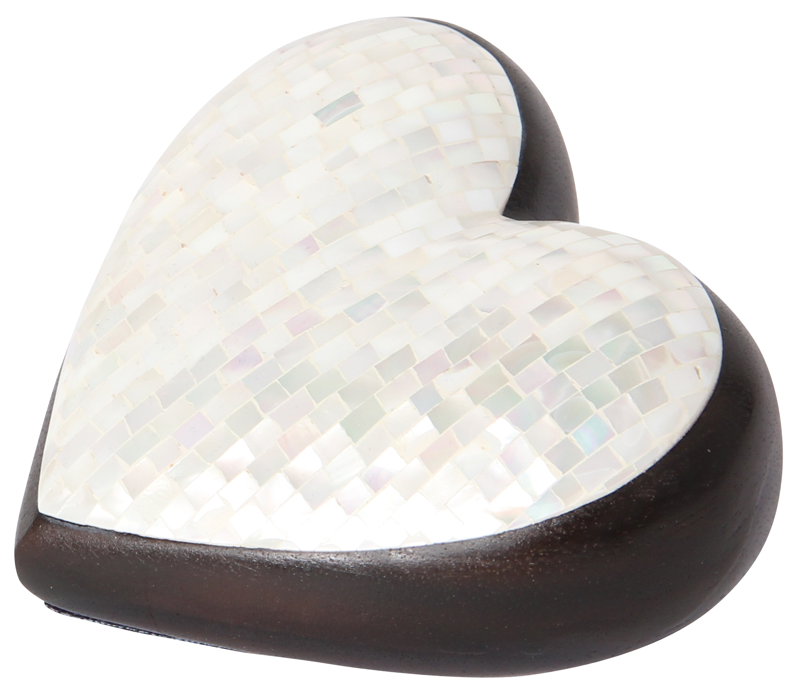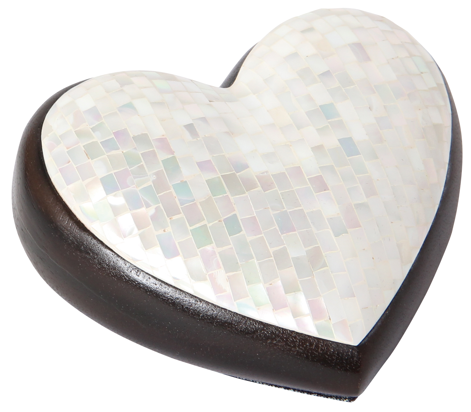 Aufwendig verarbeitetes Edelholzherz mit Capiz Muschelschalen-Verzierung. Dekoratives Geschenk, das von Herzen kommt.