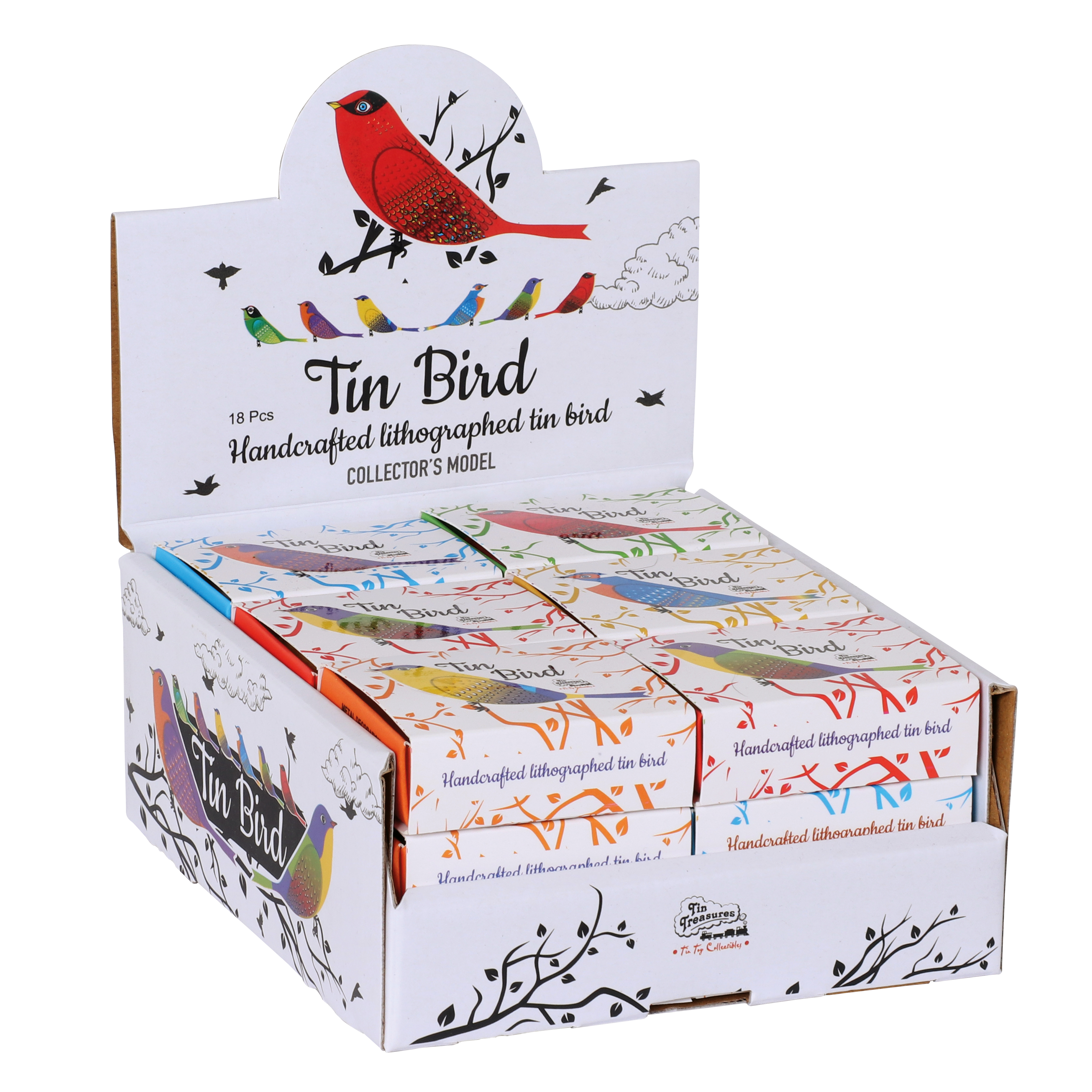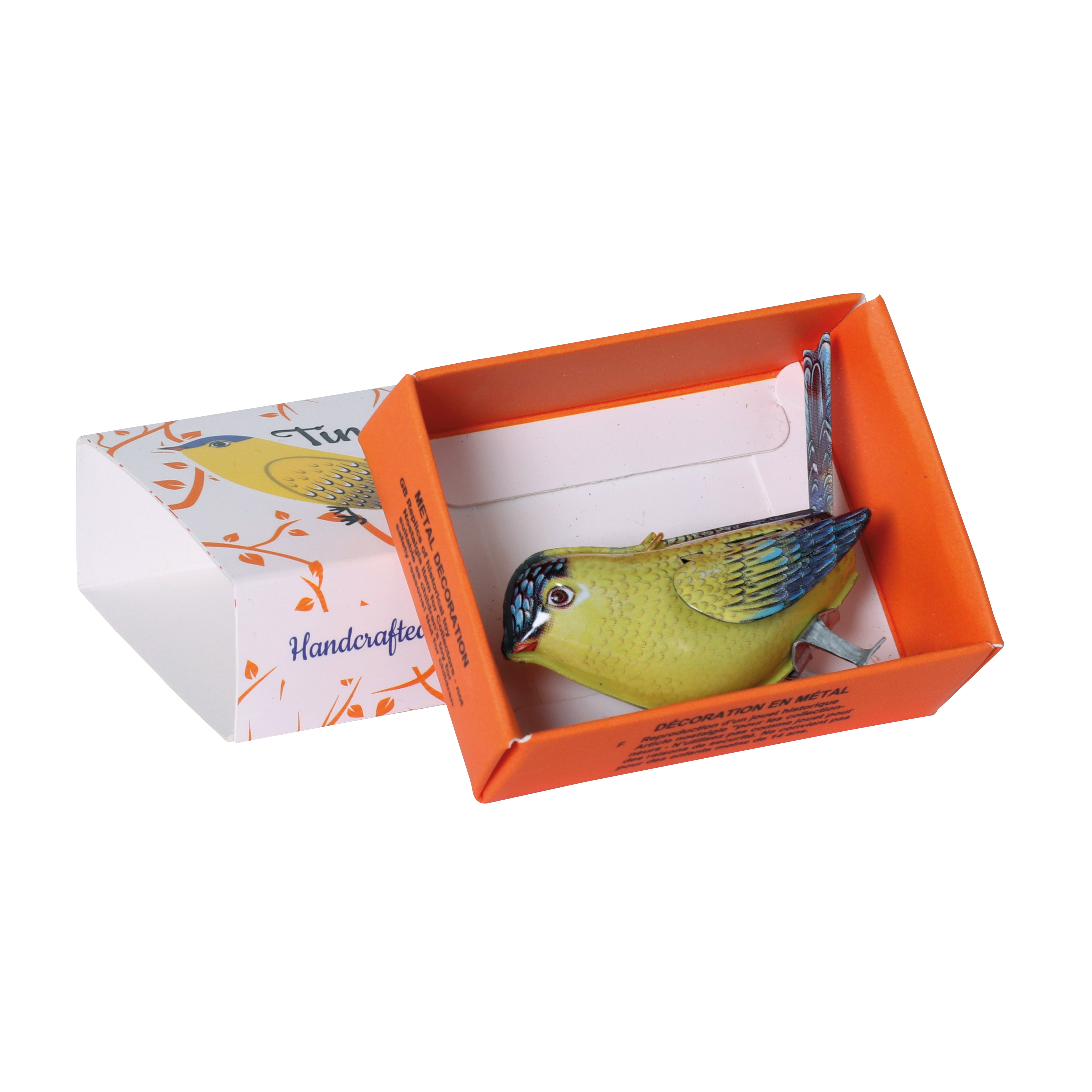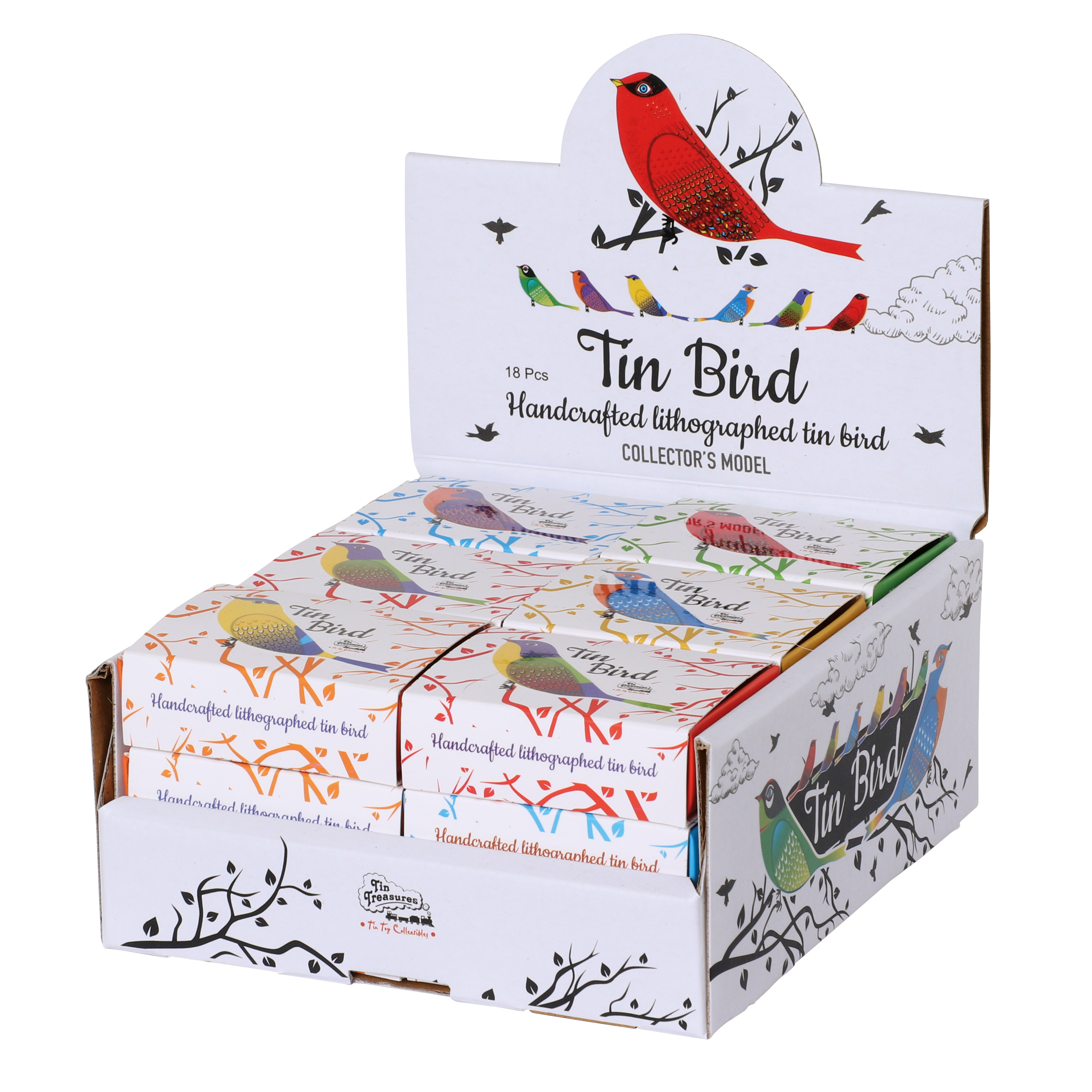 Nostalgische Dekoration aus Metall. Die liebevoll und detailreich gestalteten Vögel haben einen beweglichen Schwanz und Flügel. Drückt man das Schwänzchen nach unten hebt der Vogel die Flügel! Mit Öse zum Aufhängen eignen sich die bunten Vögel gut zum Dekorieren. Viele Designs sortiert. Je in Geschenkbox.