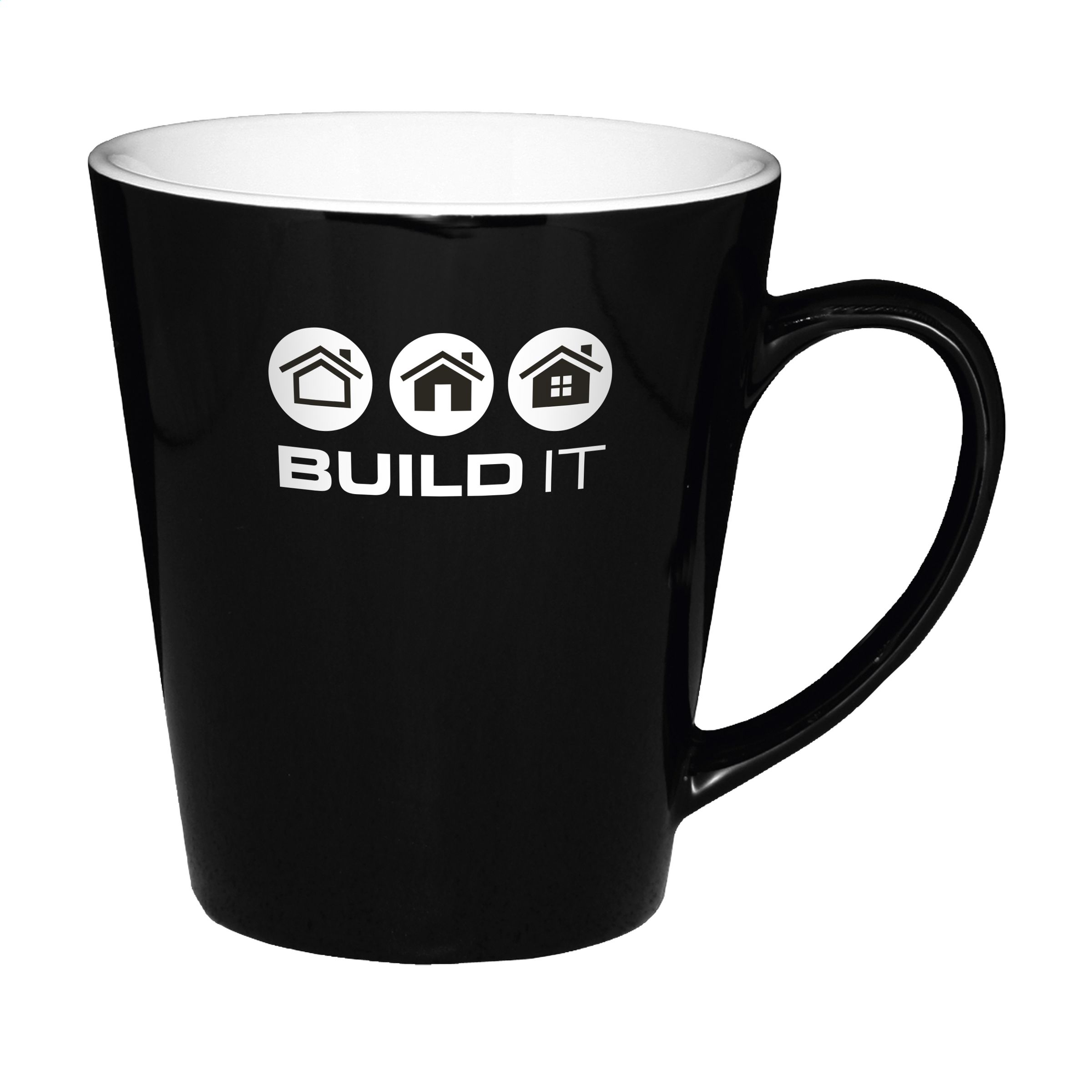 Zeitgenössische Qualitätstasse aus Keramik. Komplett in weiß oder mit farbiger Außenseite. Fassungsvermögen 310 ml. Spülmaschinengeeignet. Der Aufdruck ist spülmaschinengeprüft und nach EN 12875-2 zertifiziert.