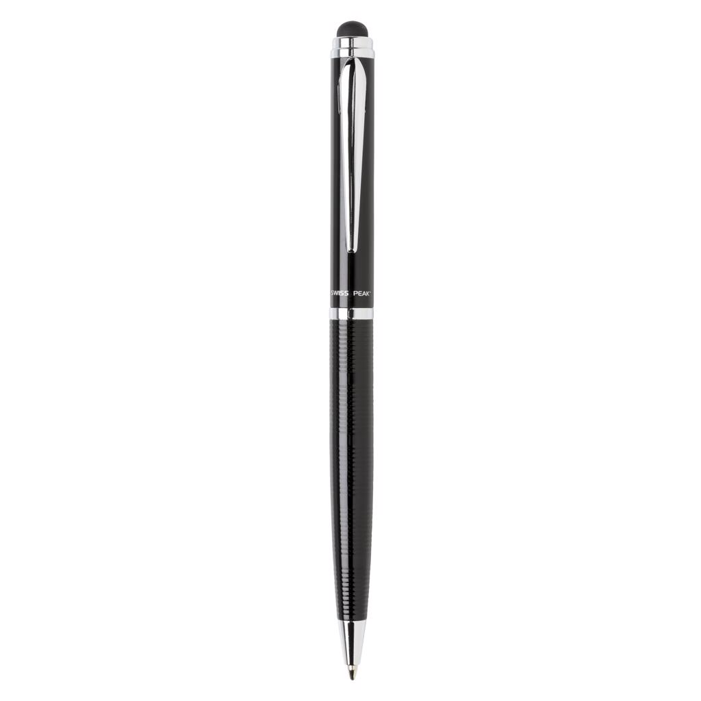 Ein besonderer Stift mit feinen Linien am Schaft. Dieser exklusive Stylus Kugelschreiber ist ein Geschenk der besonderen Art und kommt in einer Swiss Peak Röhren-Geschenkverpackung. Blau schreibend.