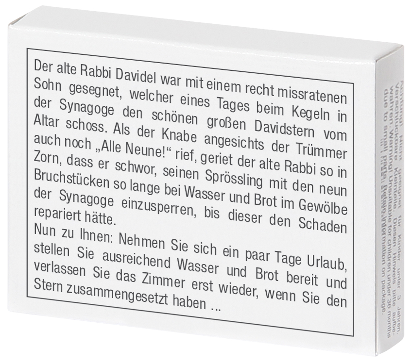 Rabbi Davidels Sohn schoss beim Kegelspielen den David-Stern vom Altar. Zur Strafe musste er die neun Teile wieder zum Stern zusammenbauen! Auch in englischer Version erhältlich: Art.-Nr. 102533.