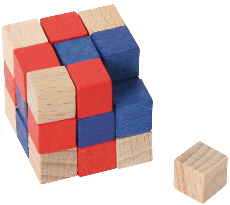 27 Farbwürfel werden zum Mosaikwürfel. Dabei müssen in jeder Dreierreihe zwei Würfel der gleichen Farbe platziert werden!