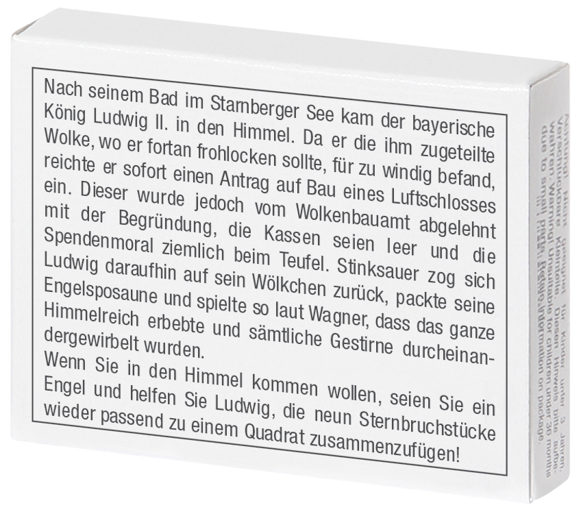 Nachdem König Ludwig im Himmel der Bau eines Luftschlosses verwehrt worden war, wirbelte er laut Posaune blasend den ganzen Sternenhimmel auseinander. Puzzeln Sie ihn aus neun Teilen wieder zusammen!