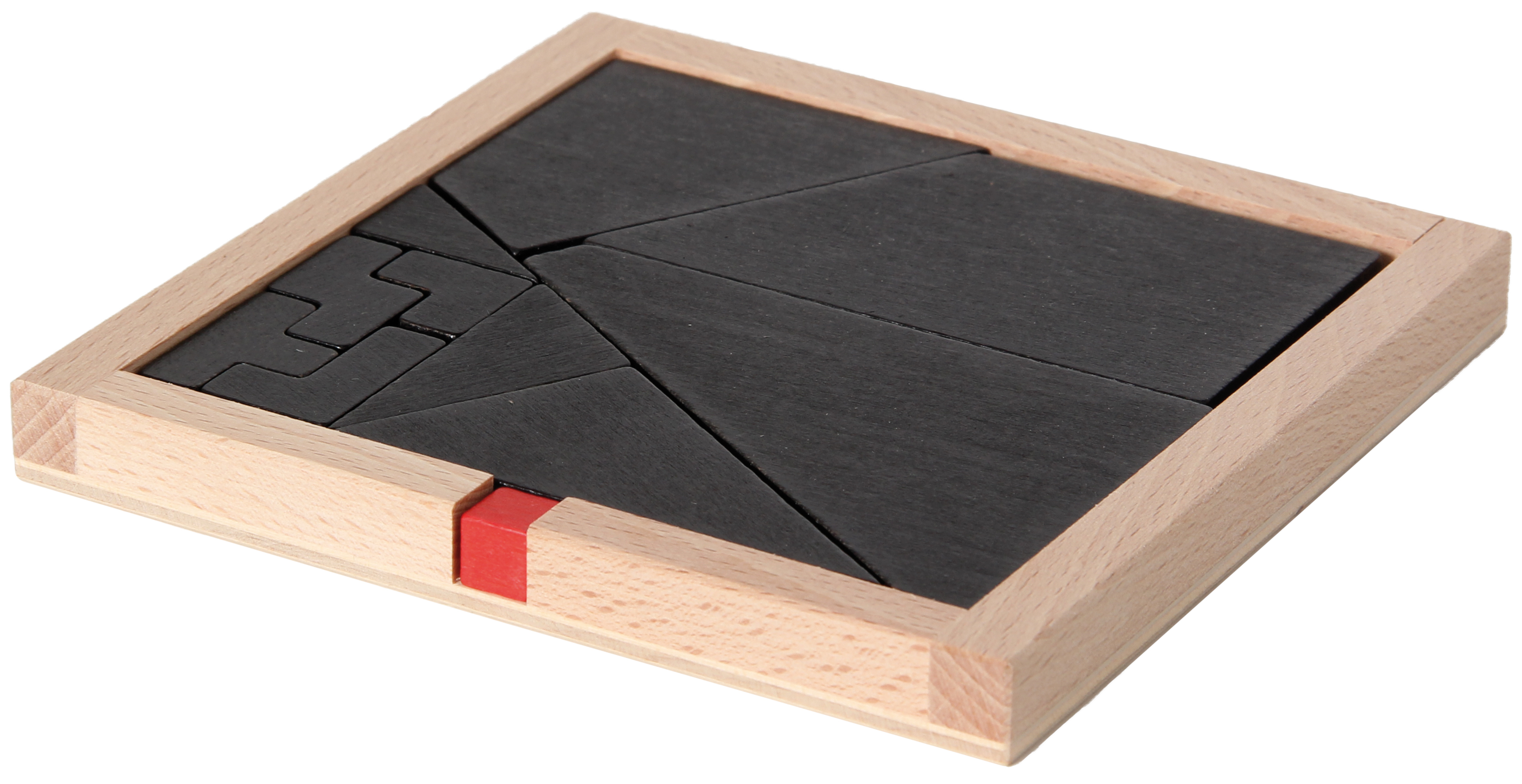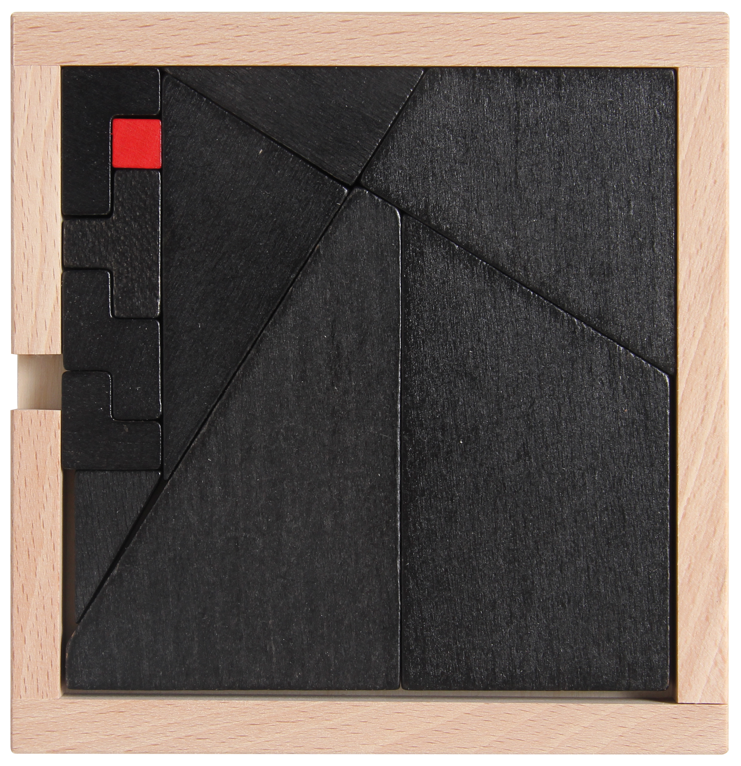Ein geometrisches Wunder aus Holz! Hat denn das kleine rote Würfelchen bei den anderen wirklich keinen Platz mehr? Wer schafft durch geschicktes Platzieren der schwarzen Teile genug Platz für den Würfel? Probieren hilft oft, Nachdenken immer! Made in Germany.