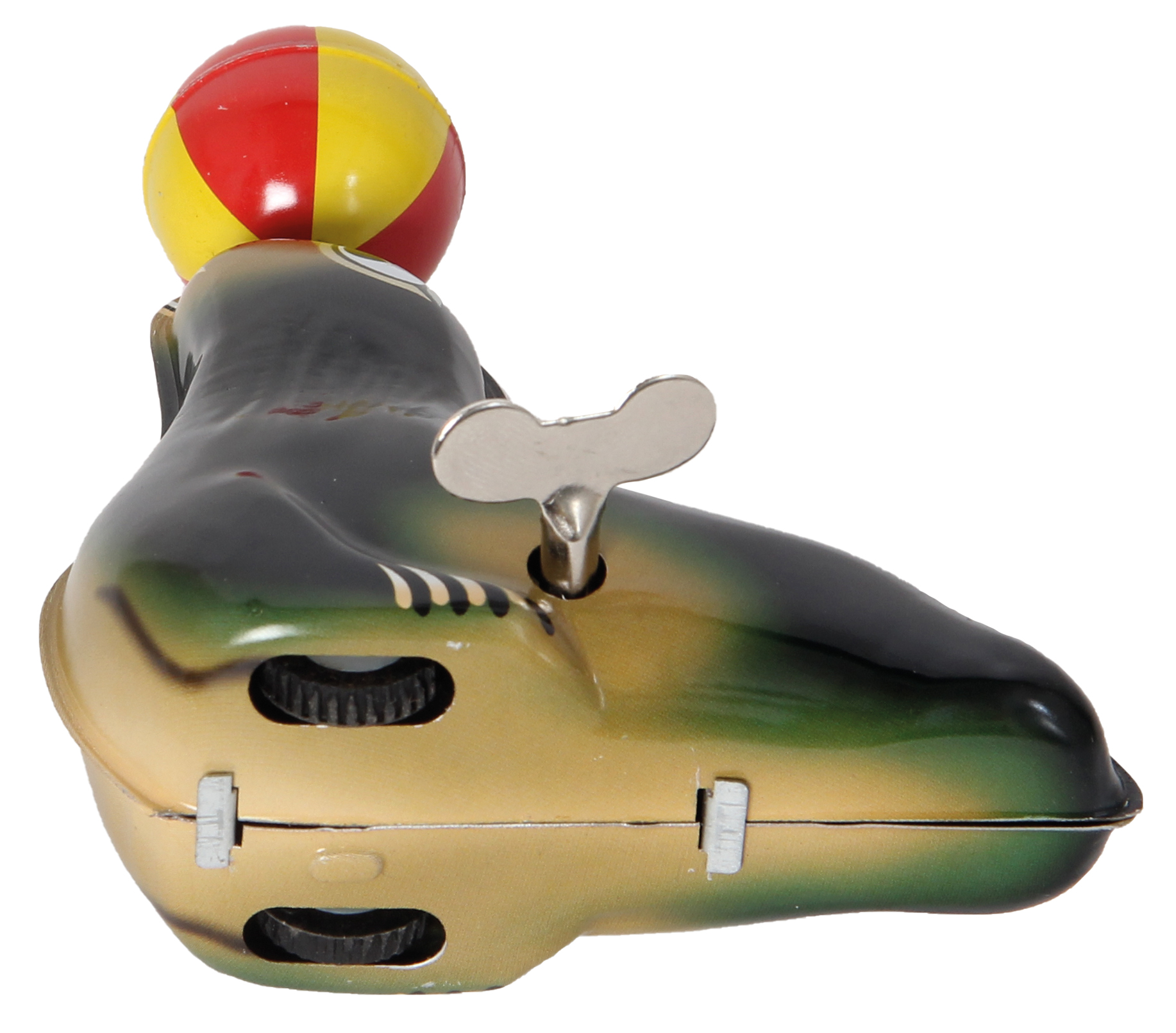 Origineller Sammler- und Nostalgieartikel aus Blech mit verblüffender Funktion: mit dem beiliegenden Schlüssel aufziehen und schon fährt der Seelöwe los und der Ball auf seiner Nase dreht sich!