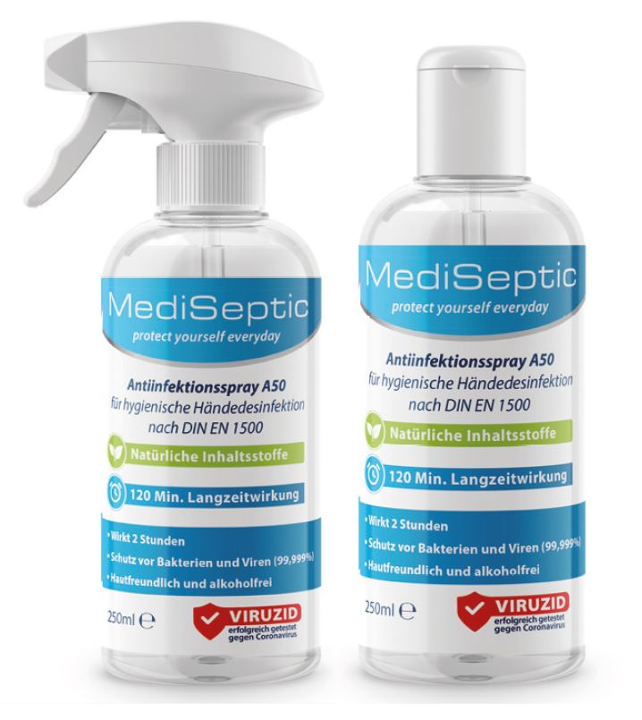 Inhalt: 1 Flasche 250 ml mit Sprühkopf und 1 Flasche 250 ml mit Dosierdeckel Desinfektionsspray A50 für hygienische Händedesinfektion nach DIN EN 1500 Ideal in der Öffentlichkeit beim Griff an Haltestangen in Bus und Zug, auf Toiletten, bei Türfallen, Einkaufswagen, Geldautomaten usw. Natürliche Inhaltsstoffe. Hautfreundlich und alkoholfrei. Anwendung: Die Hände mit ca. 3 - 5 ml unverdünnter Flüssigkeit benetzen und verreiben. Achten Sie besonders auf Daumen und Fingerspitzen. Diese kommen am häufigsten mit kontaminierten Flächen oder Gegenständen in Kontakt. Häufigkeit: Nach Bedarf wiederholen, um eine weitere Vorbeugung von 2 Stunden zu garantieren. Einwirkzeit: 1 Minute. Bestandteile: Benzalkoniumchlorid 0,1% - Sonstige Bestandteile: H2O (Wasser), Mineralische Salze, Organische Säuren, Organische Salze, Ätherische Öle, Kationische Polymere Hinweise: - Nach Gebrauch fest verschließen und kühl lagern - Bei Temperaturen nicht über 30°C/86°F aufbewahren - Restentleerte Behälter entsprechend den örtlichen Vorschriften der Entsorgung zuführen - Für Kinder unzugänglich aufbewahren. Kein Gefahrstoff im Sinne der CLP-VO, nicht brennbar, ohne Alkohol, nicht toxisch, ohne Tenside und Aldehyde. VE: 840 Stück pro Palette
