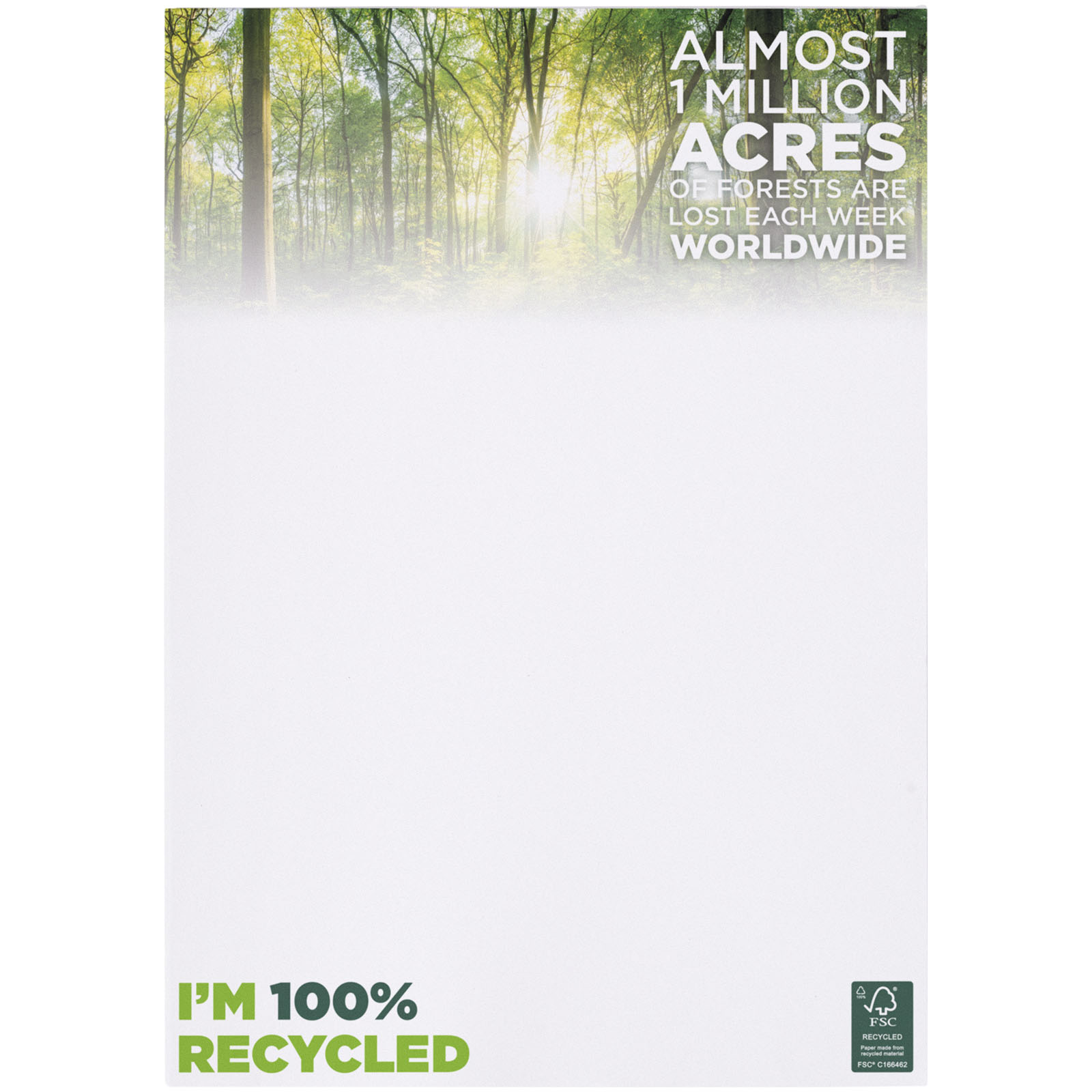 Weißer Desk-Mate® A4 Notizblock mit 80g / m2 recyceltem Papier. Ein vollfarbiger Druck auf jedem Blatt möglich. Erhältlich in 3 Größen: 25, 50, 100 Blatt.
