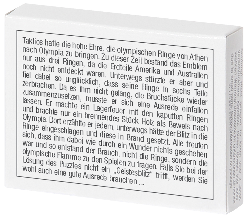 Der Träger der Olympischen Ringe stürzte und zerbrach diese in sechs Teile. So entzündete er ein Bruchstück und lief als vermeintliches Opfer eines Blitzes nach Olympia. So entstand das olympische Feuer! Auch in englischer Version erhältlich: Art.-Nr. 102541.