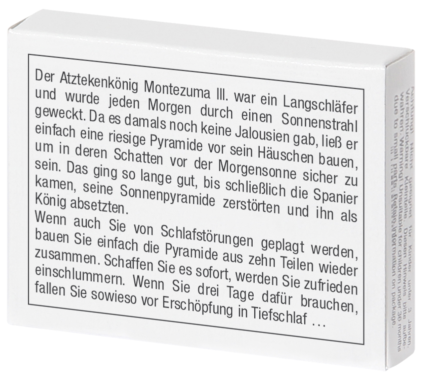 Um von der Morgensonne nicht geweckt zu werden, baute sich der Atztekenkönig eine Sonnenpyramide vor sein Häuschen. Doch die Spanier zerstörten sie ihm wieder - so eine Gemeinheit! Bauen Sie die Pyramide aus zehn Teilen doch wieder auf!