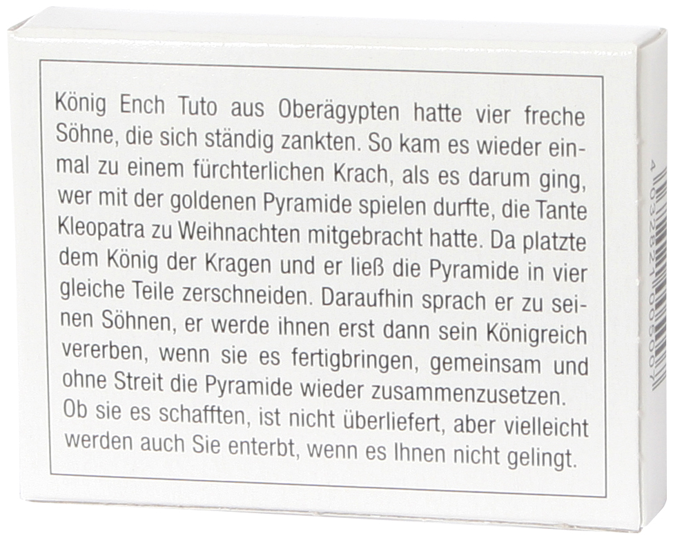 Da sich seine vier Söhne ständig um die Spielpyramide von Tante Cleopatra zankten, zersägte König Ench Tuto sie. Bauen Sie die vierteilige Pyramide wieder auf und der König vererbt Ihnen sein Reich!