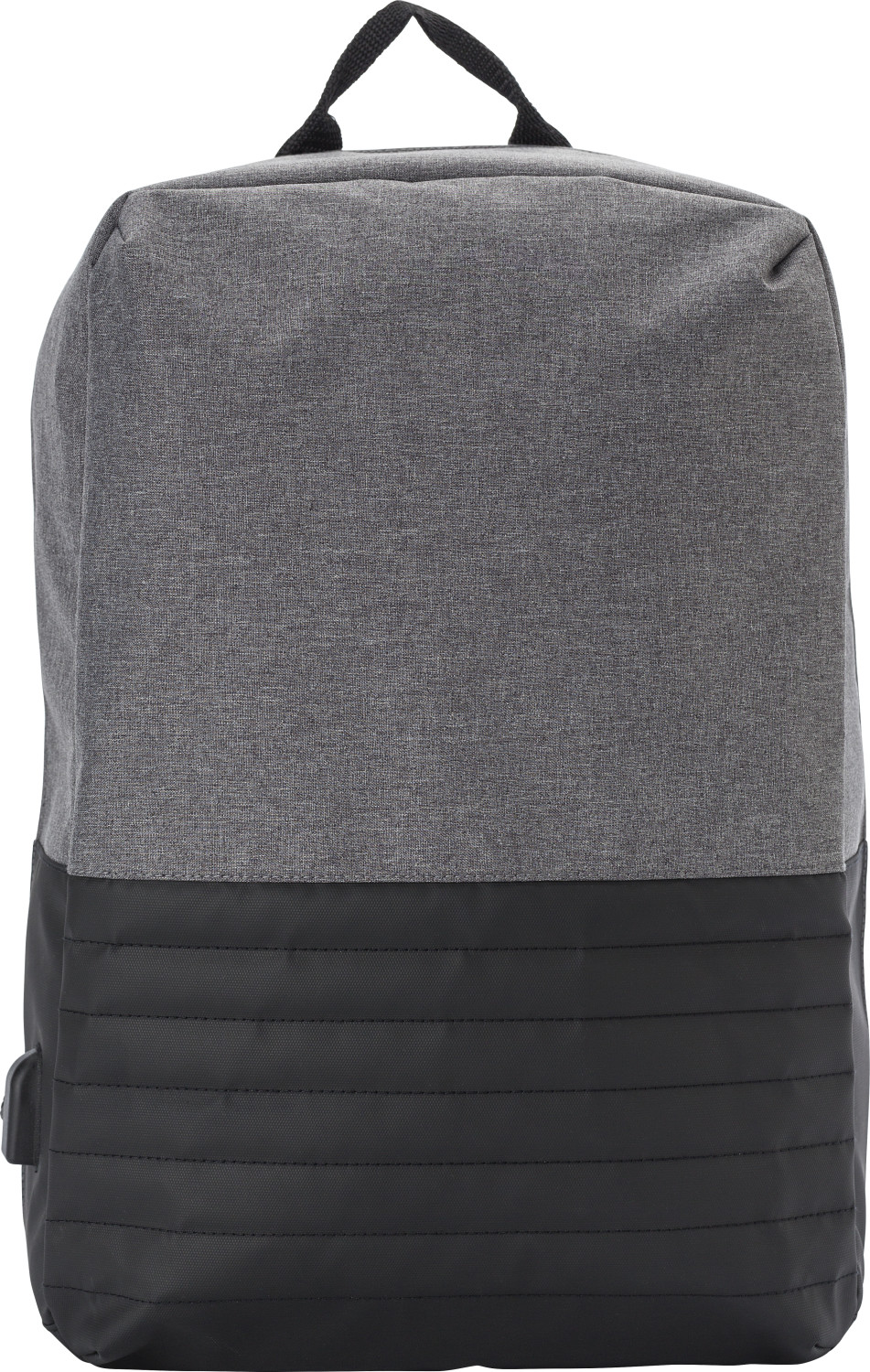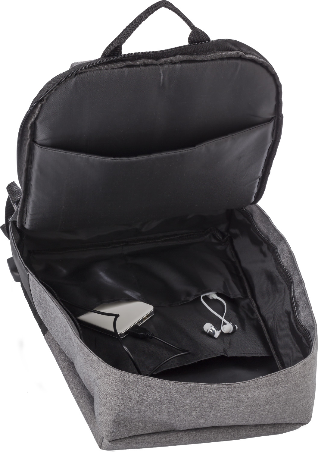 Diebstahlsicherer Rucksack 'Birmingham' aus PVC (600D/300D) mit verstellbaren und gepolsterten Schultergurten, gepolstertem Rückenteil, gepolstertem Laptopfach (ca. 38cm), großem RV-Hauptfach, USB-Anschluss an der Außenseite (innen mit Kabel und USB-Anschluss).