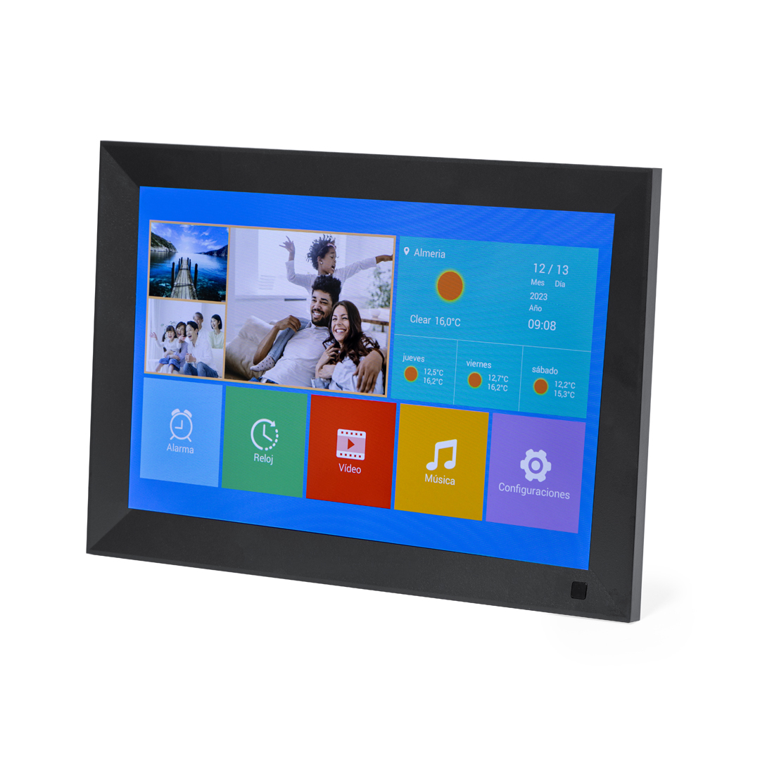 Digitaler Fotorahmen mit 10,1 Zoll. Mit hochauflösendem 1280 x 800 Pixel IPS-Touchscreen, WiFi-Konnektivität und ausgestattet mit intelligenten Funktionen wie Wetteranzeige, Alarm und Uhr. Außerdem verfügt er über ein Menü, mit dem Sie beim Betrachten von Videos, beim Durchsuchen von Fotos und beim Hören von Musik die Welt der Möglichkeiten erkunden können, wobei Sie die Wahl zwischen horizontaler und vertikaler Ansicht haben. Mit rückseitiger Halterung und Schlitzen für die Wandmontage. AC 220V-240V Stromversorgung, Ladegerät im Lieferumfang enthalten. Präsentiert in einer Design-Kraftstoffbox und mit einer Bedienungsanleitung in Englisch und Spanisch.