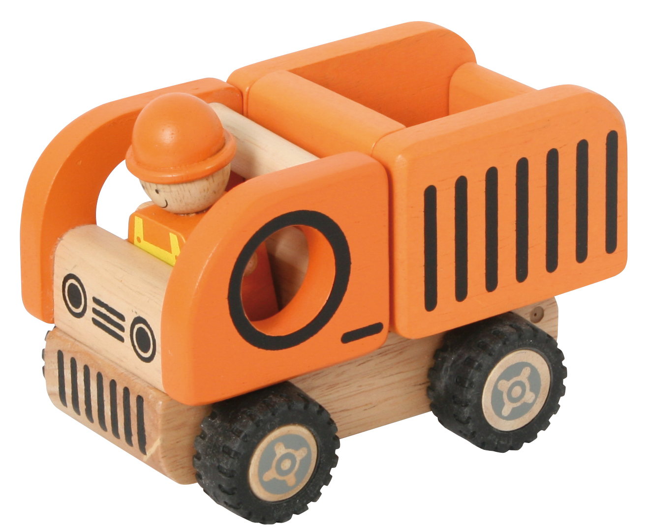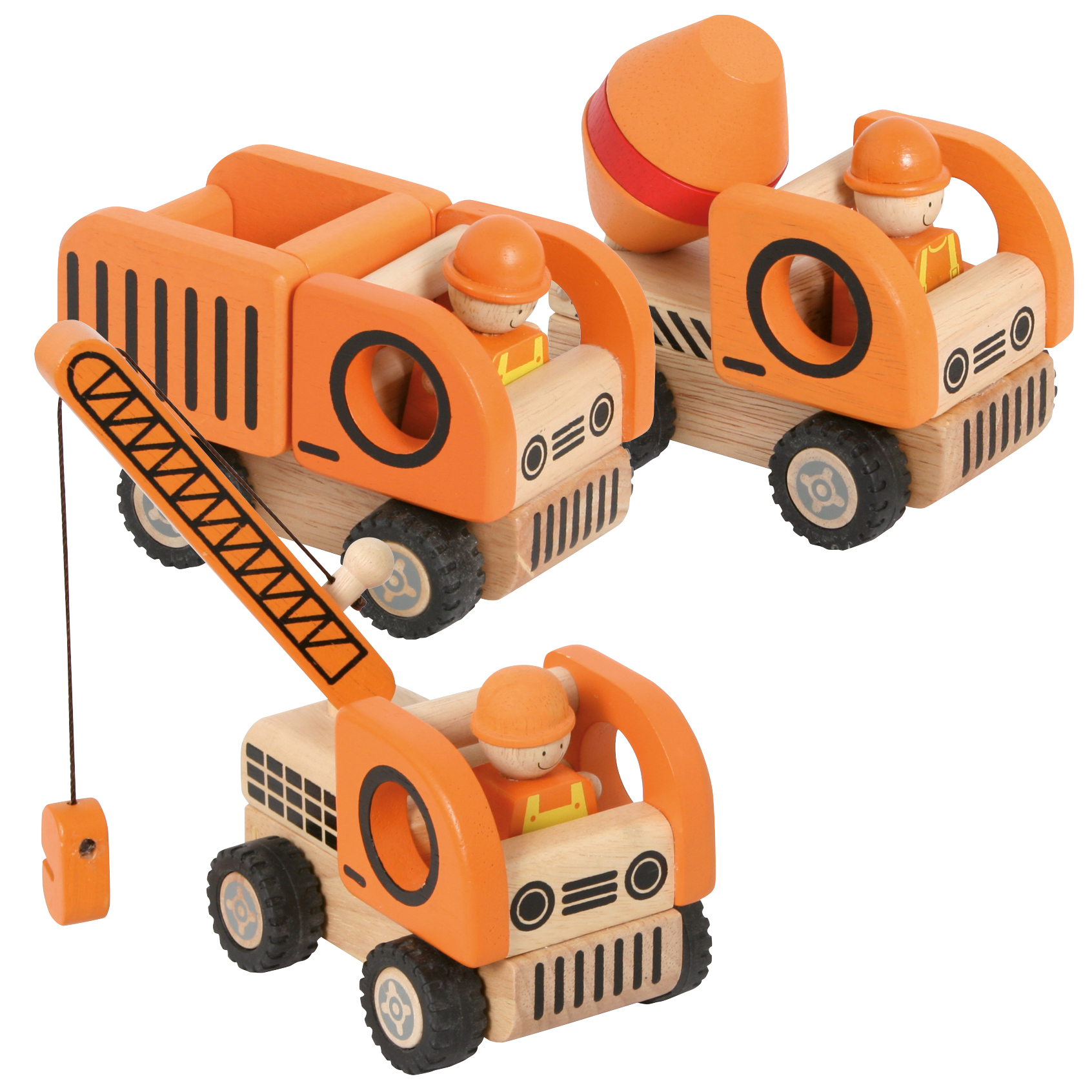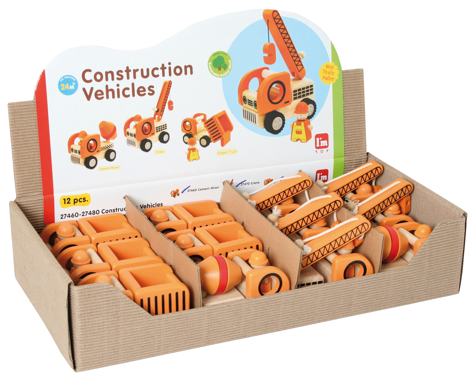 Inhalt: 5 x Kran, 5 x Kipplader, 2 x Zementmischer. Fahrzeuggröße: ca. 12 x 7,5 x 9/12 cm. Gewicht: ca. 250 g. Das Display enthält zwölf robuste Nutzfahrzeuge für kleine Entdecker ab 19 Monaten. Die hochwertigen Fahrzeuge aus Gummibaumholz haben Gummireifen und jeweils einen Fahrer. Das Holzmännchen kann man herausnehmen. Jedes Fahrzeug hat Teile, die man bewegen kann, wie z. B. die Mischtrommel des Zementmischers ' Beim Spiel mit den kleinen Nutzfahrzeugen trainieren die Kids ihre Motorik, fördern ihre soziale Interaktion und haben jede Menge Spaß beim lehrreichen Rollenspiel.