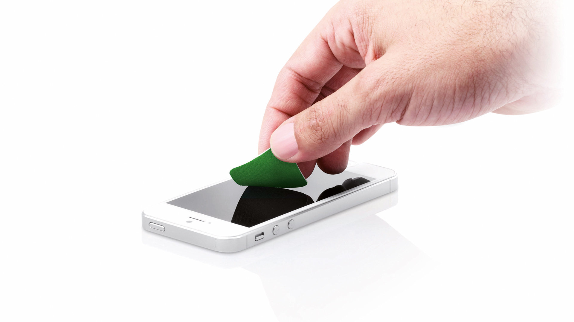 Bildschirmreiniger mit minimalistischem Design aus weicher Mikrofaser in coolen Farben. Mit selbsthaftender Rückseite.