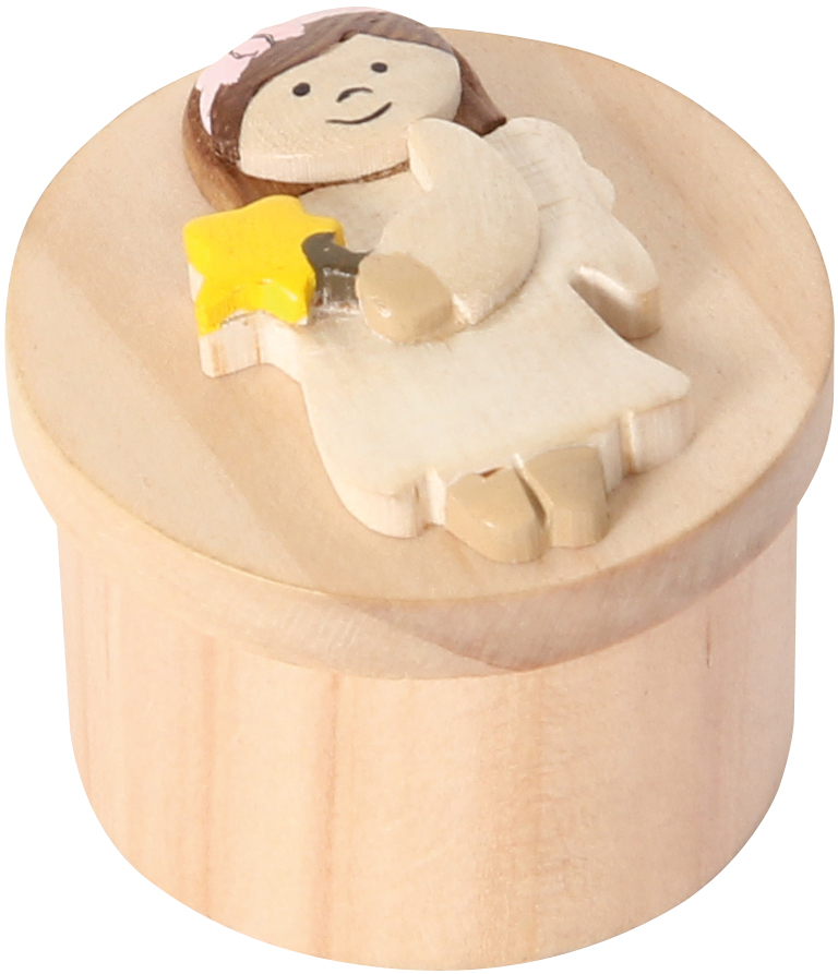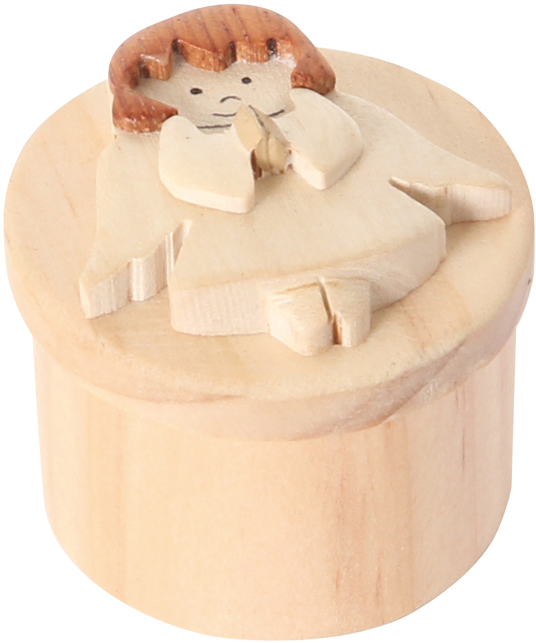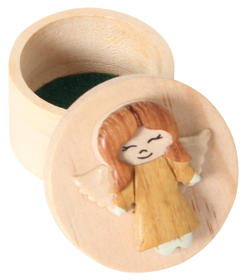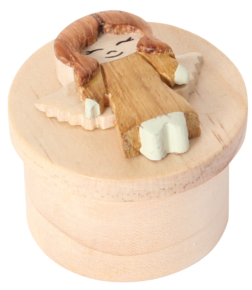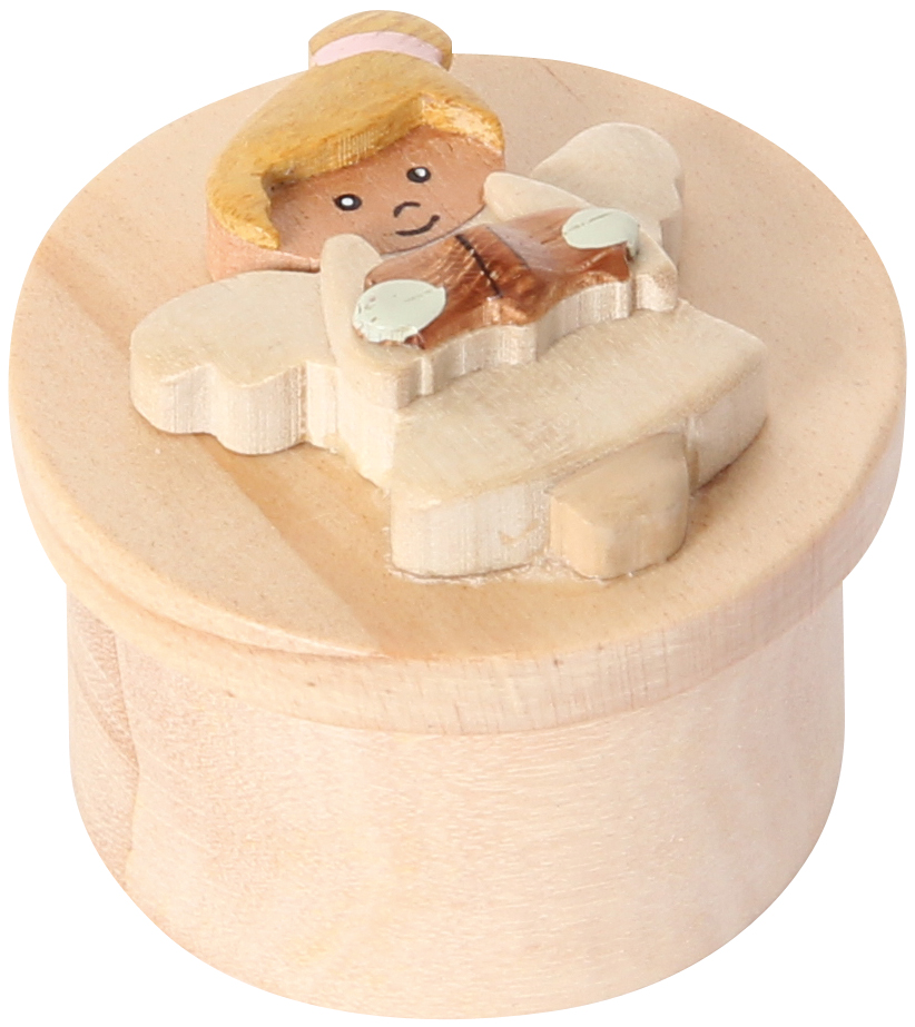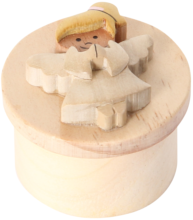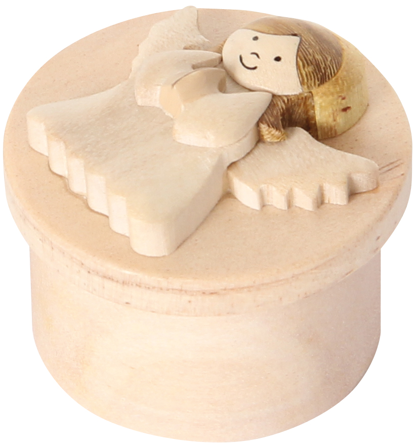 Kleine Döschen aus Holz, aufwändig verziert mit 6 verschiedenen Engelfiguren. Praktischer Verschluß durch Kautschukscheibe.
