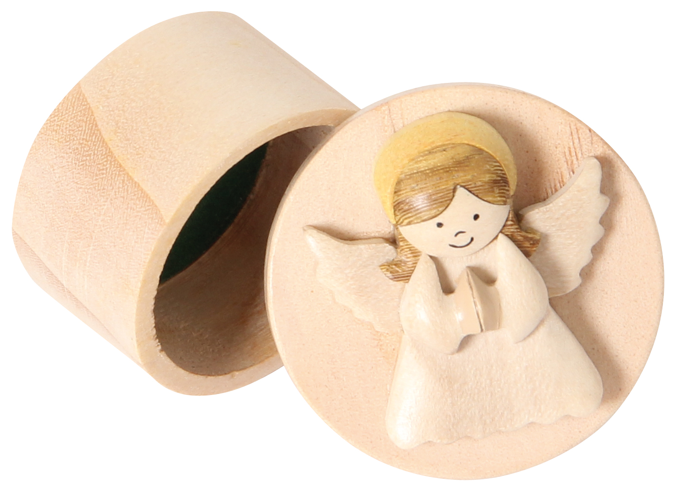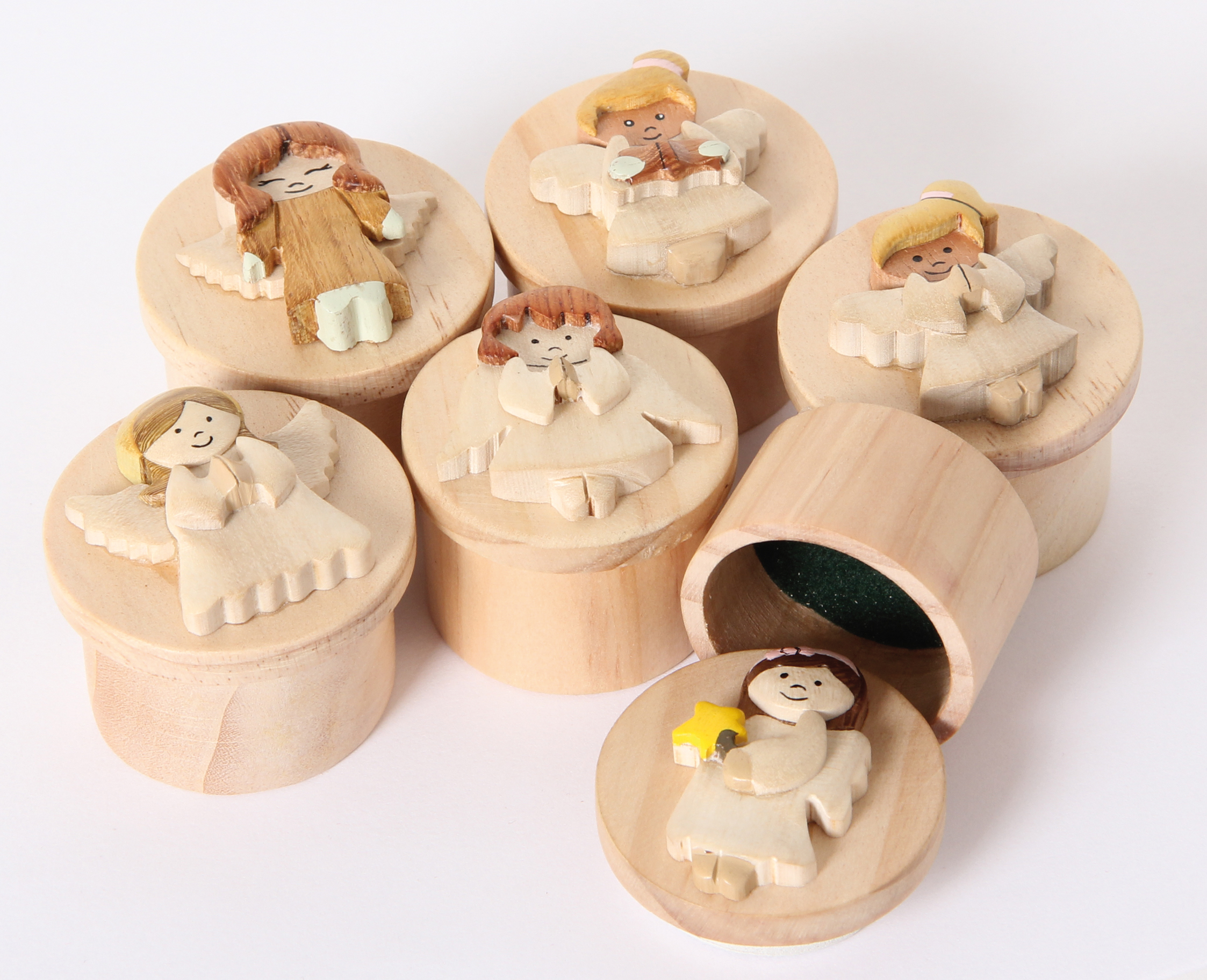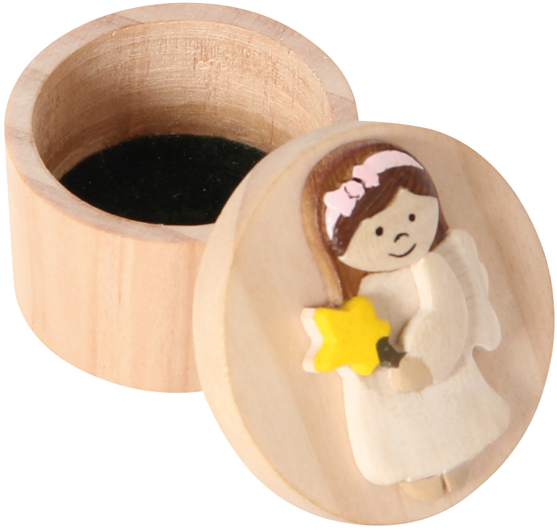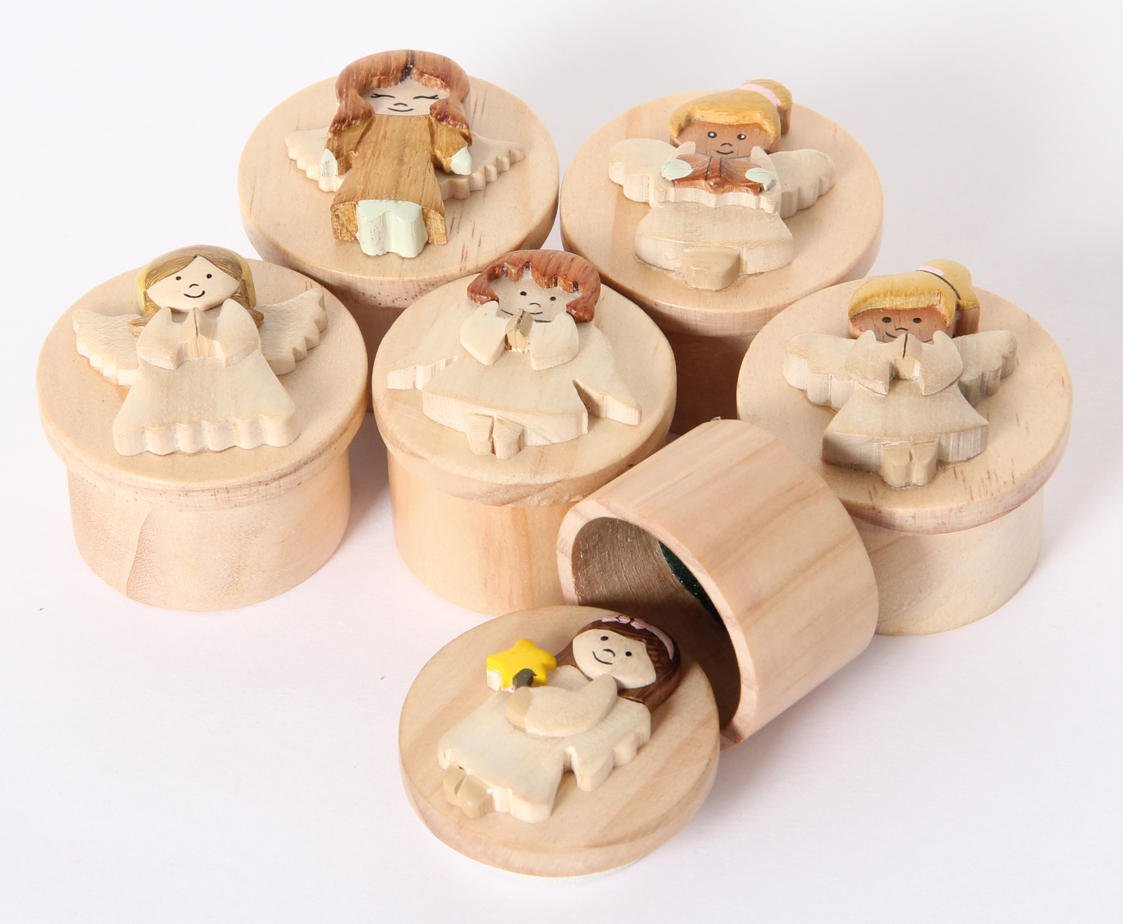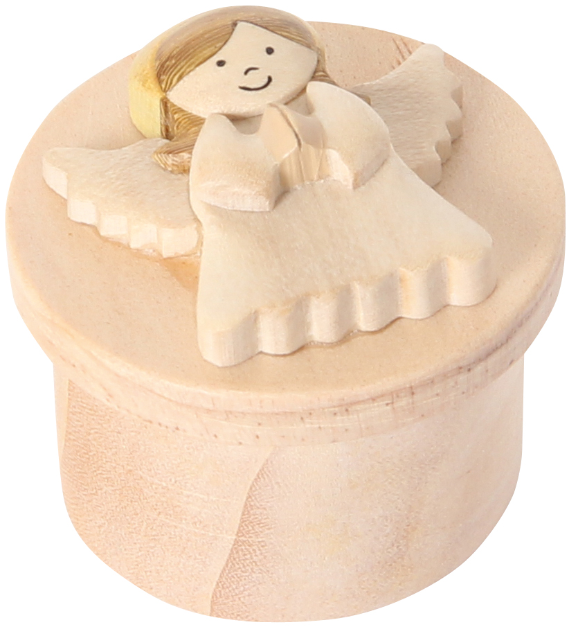 Kleine Döschen aus Holz, aufwändig verziert mit 6 verschiedenen Engelfiguren. Praktischer Verschluß durch Kautschukscheibe.