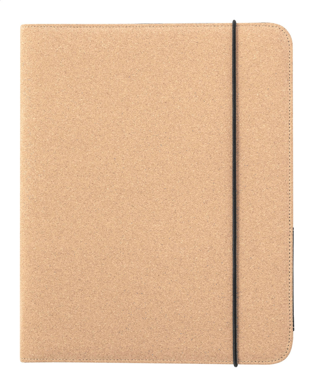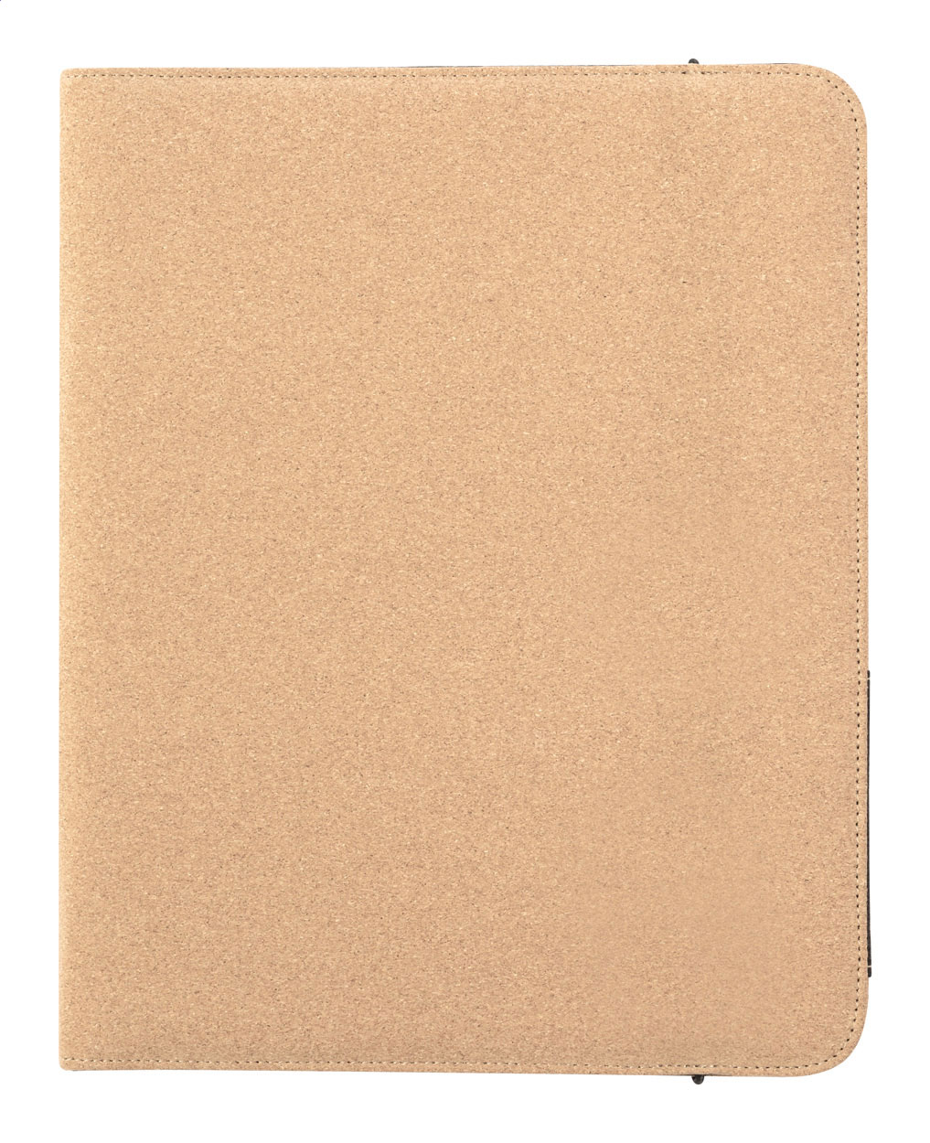 Dokumentenmappe aus Naturkork mit Notizblock mit 20 linierten Blättern und mehreren Organizer-Innentaschen.