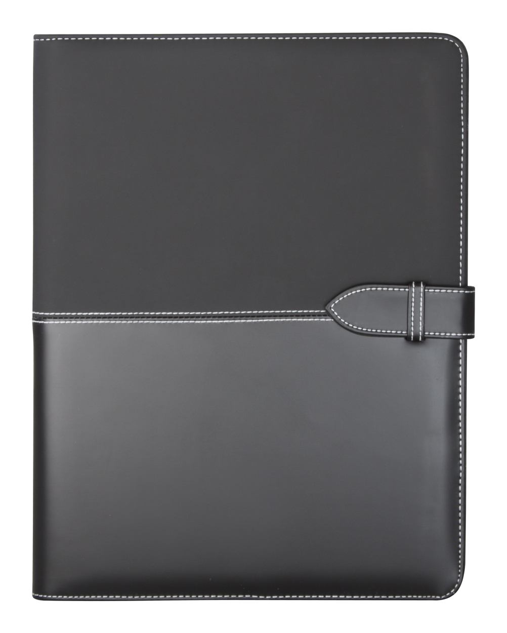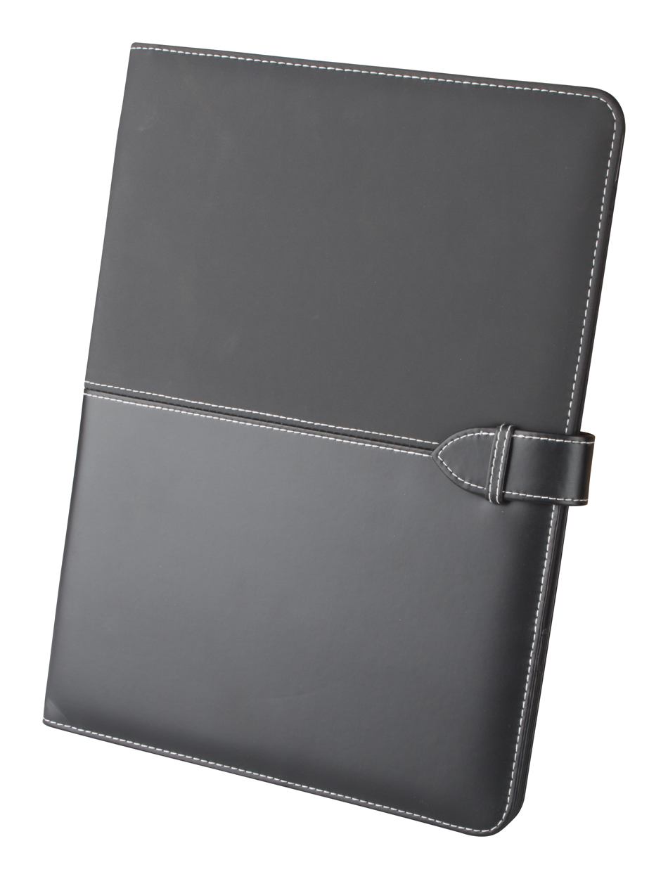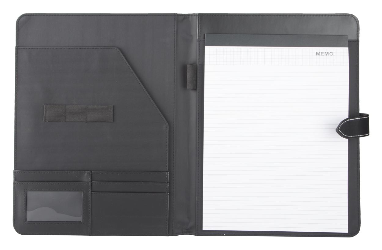 A4 Dokumentenmappe mit Notizblock (20 Seiten, liniert), Stiftschlaufe und Visitenkartenfach. Material: Kunstleder.