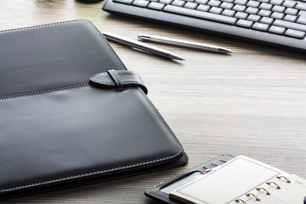 A5 Dokumentenmappe mit Notizblock mit 20 Seiten (liniert) und Stiftschlaufe. Material: Kunstleder.