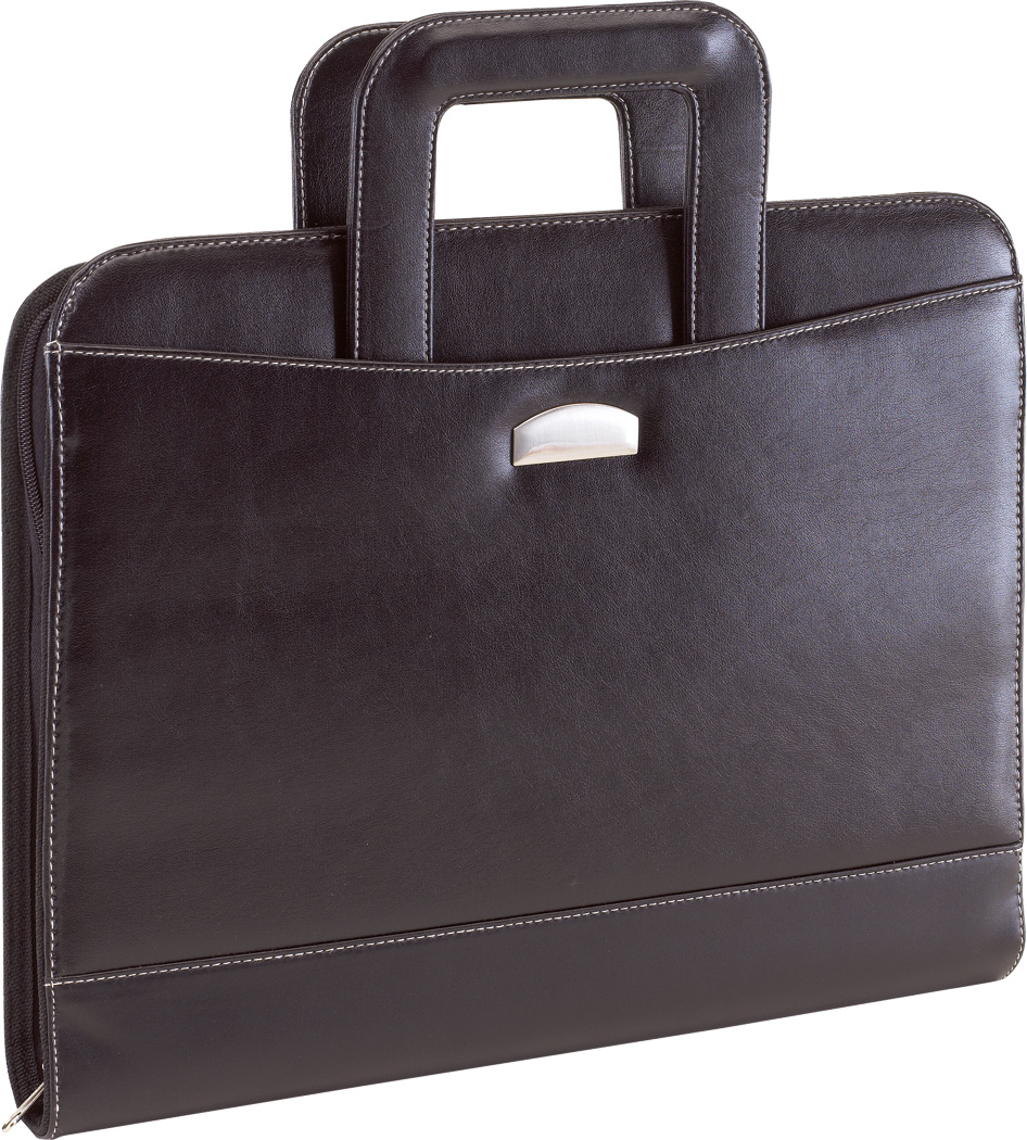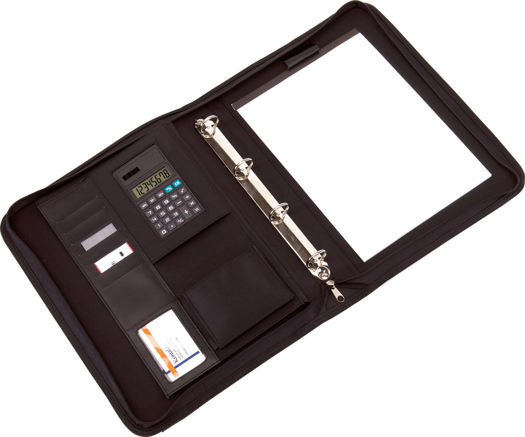 Dokumentenmappe NOBLESSE RING im DIN-A4-Format: umlaufender Reißverschluss zum Verschließen, innen diverse Einsteckfächer, 1 Klarsichtfach, 4-Ring-Mechanik, inkl. Schreibblock (blanko), Schlaufe für 1 Schreibgerät, Taschenrechner, außen versenkbare Tragegriffe, dekorative Ziernähte, in Leder-Optik mit Metallplättchen für Ihre Werbeanbringung