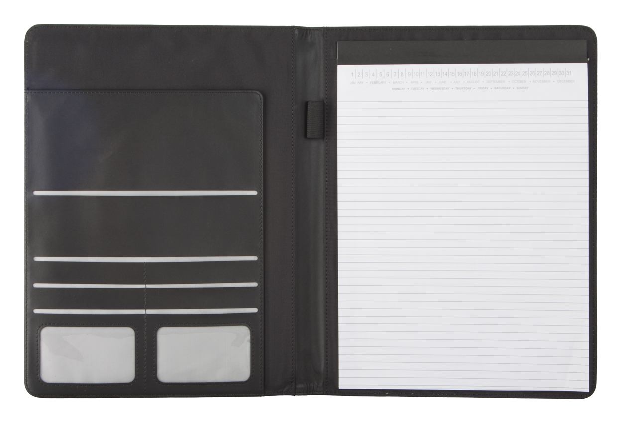 A4 Dokumentenmappe mit Notizblock (20 Seiten, liniert), Stiftschlaufe und Visitenkaretnfach. Material: Kunstleder.