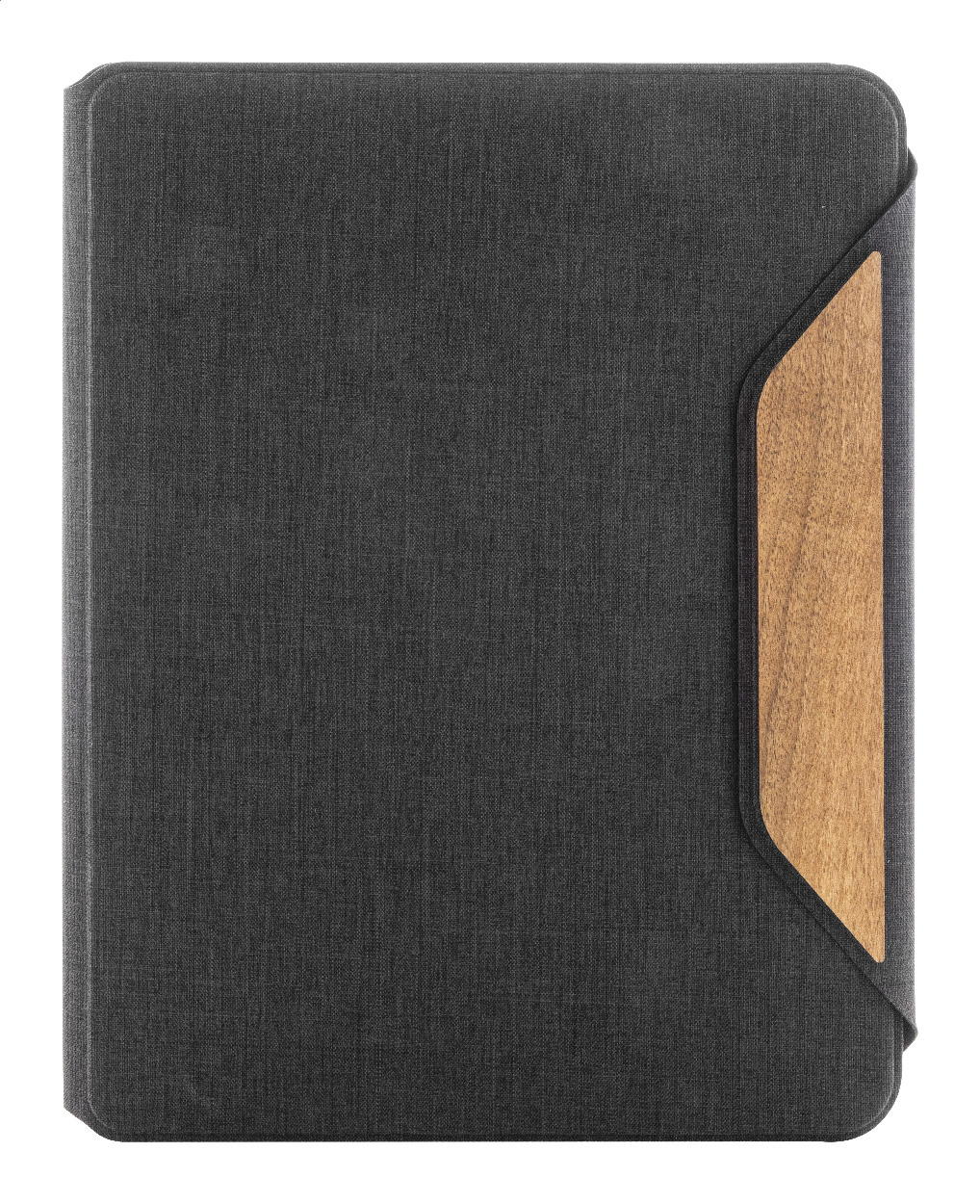 Dokumentenmappe im A4-Format aus RPET-Polyester mit Walnussholzdetails, mehreren Organizer-Innentaschen und Magnetverschluss. Inklusive Notizblock mit 20 linierten Seiten aus Recyclingpapier.