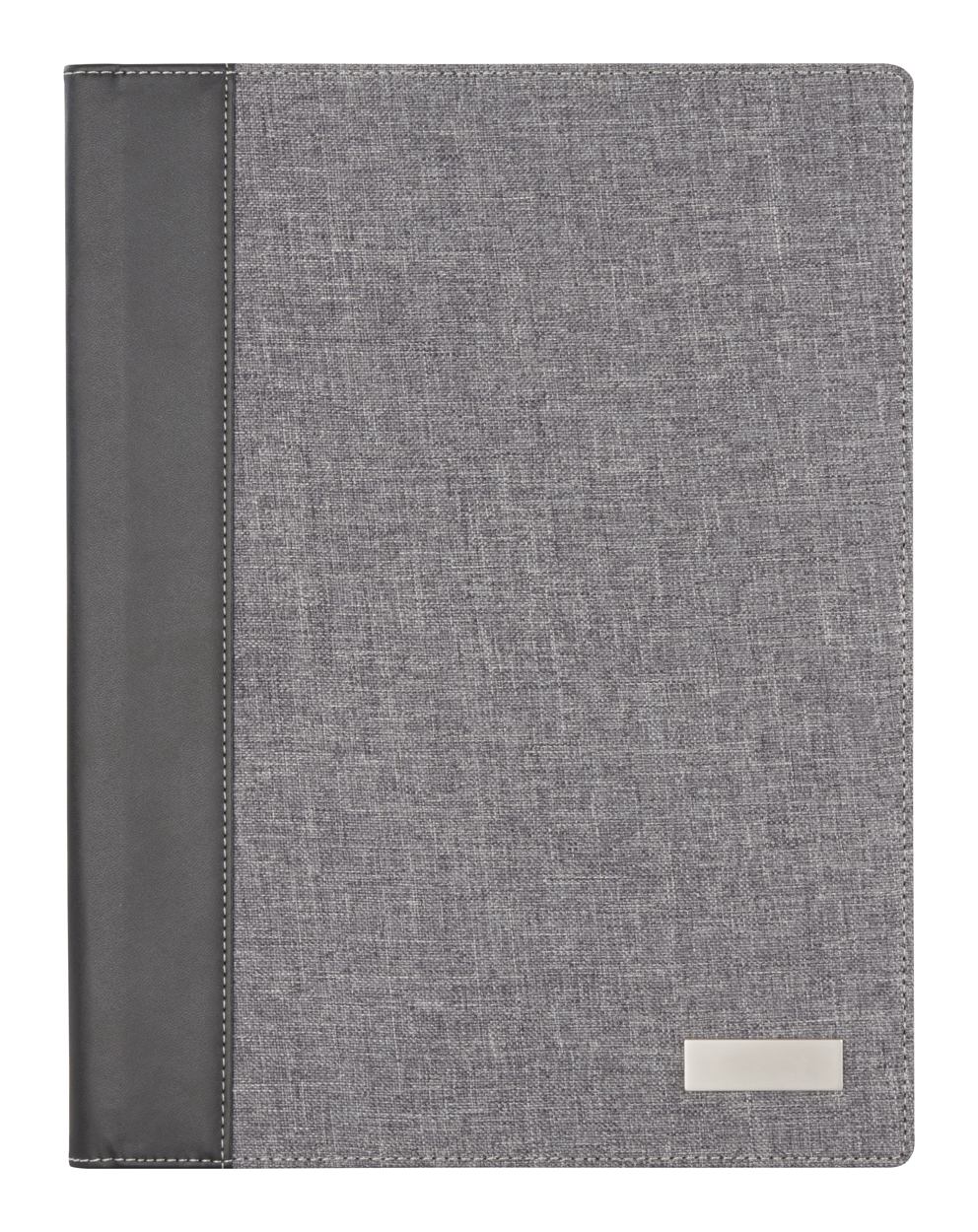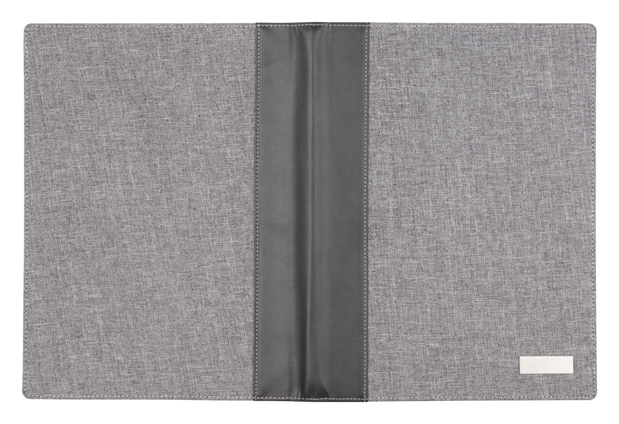 A4 Dokumentenmappe mit Notizblock mit 20 Seiten (liniert) und Metallplättchen. Material: Kunstleder und Leinen.
