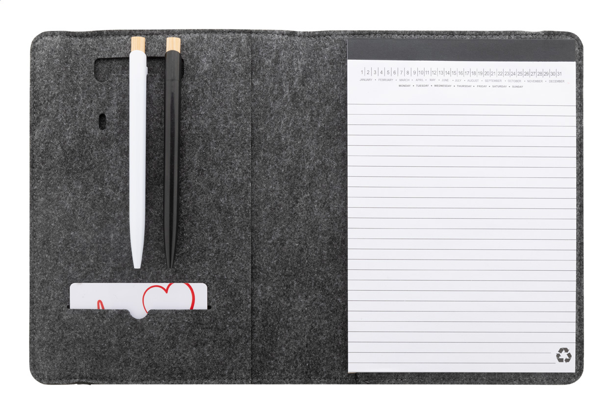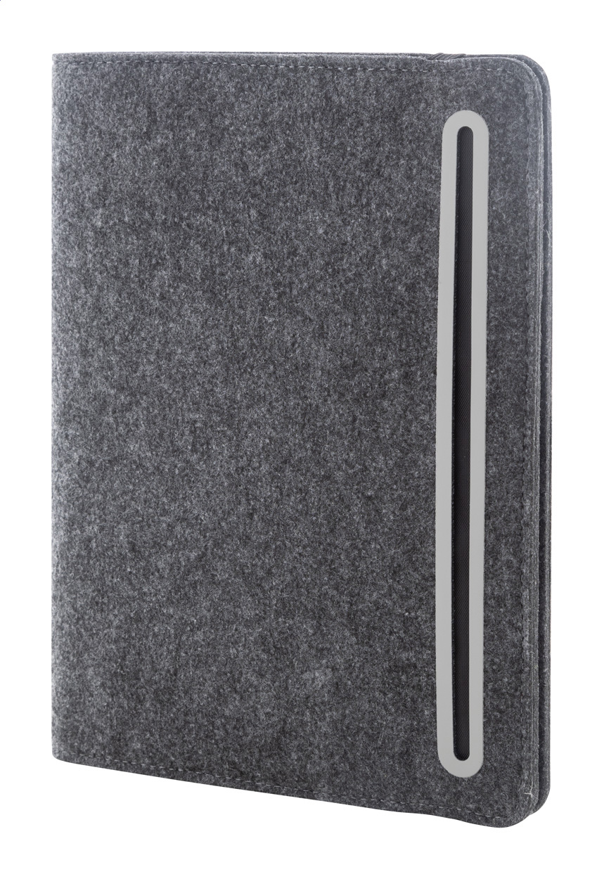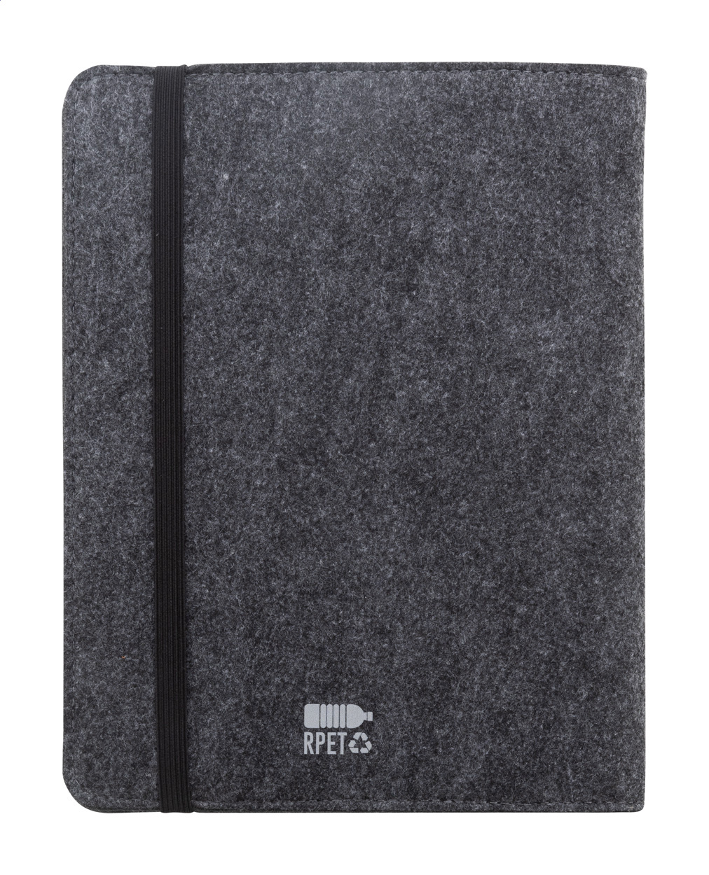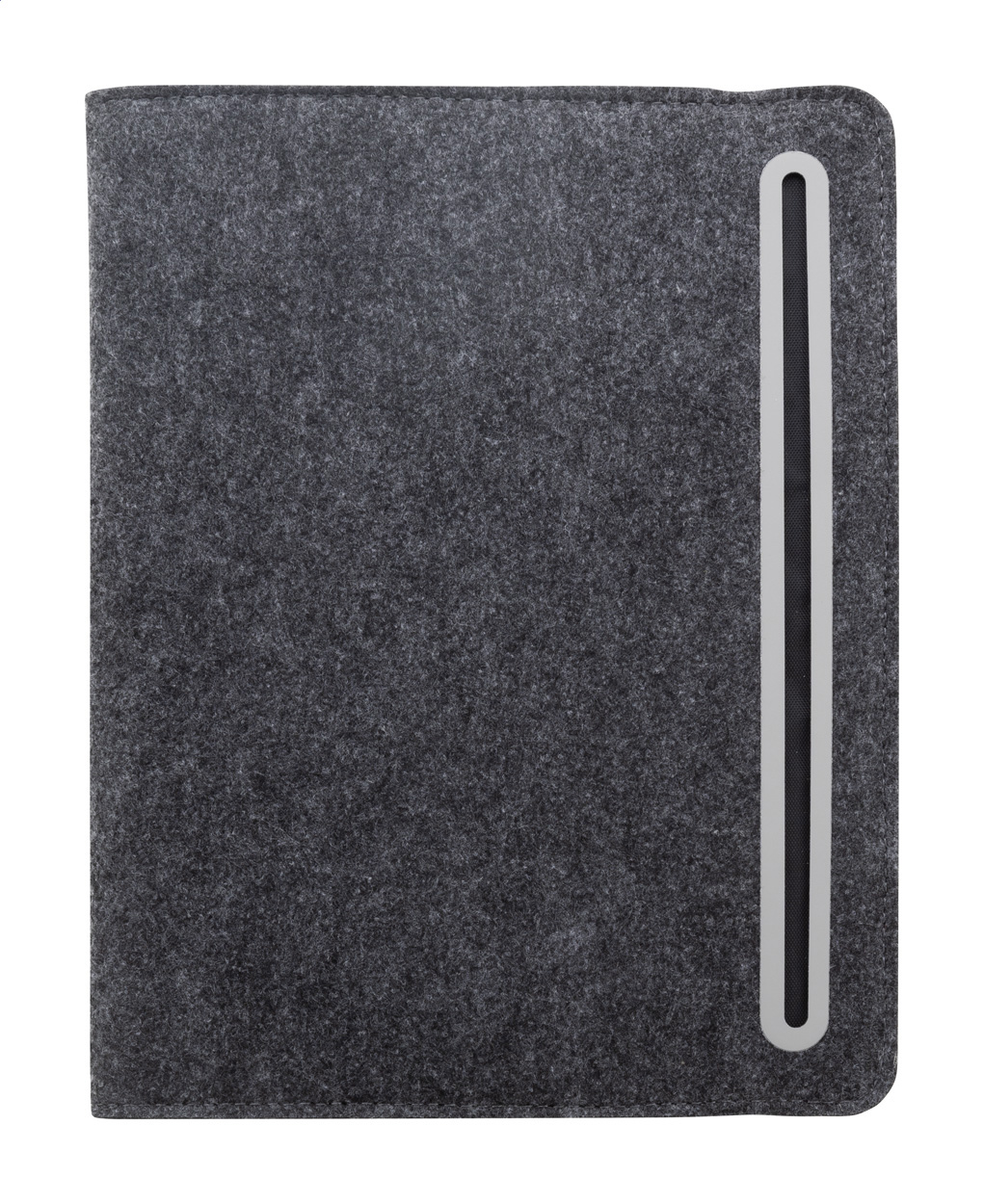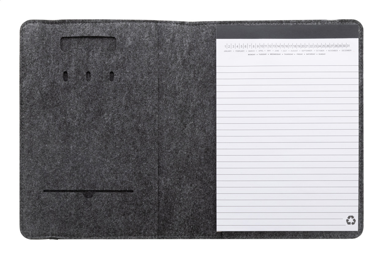 Dokumentenmappe im A5-Format aus RPET-Filz mit einer Fronttasche und mehreren Organizerfächern innen. Enthält einen Notizblock mit 20 linierten Seiten aus recyceltem Papier.