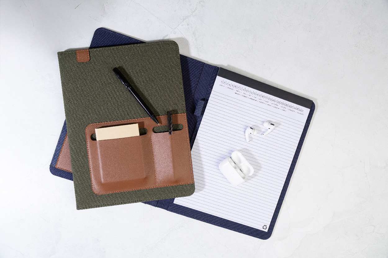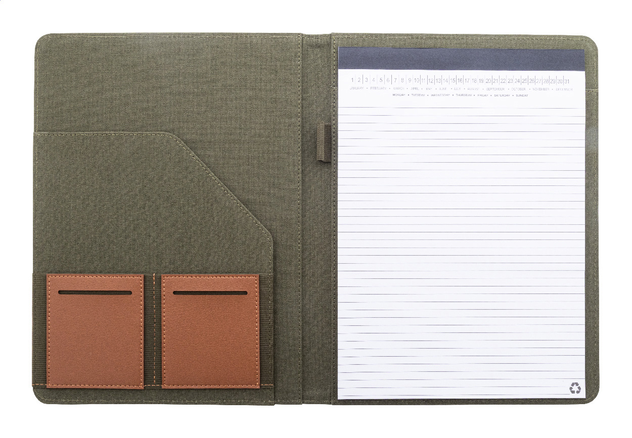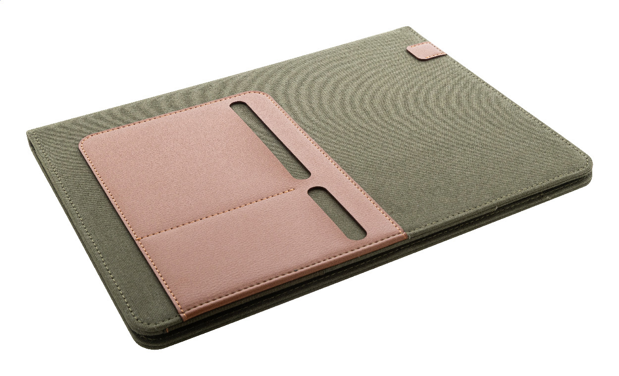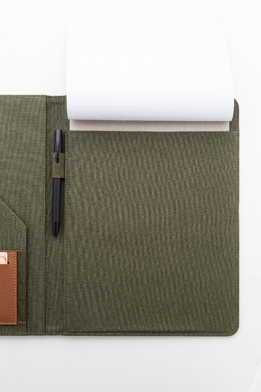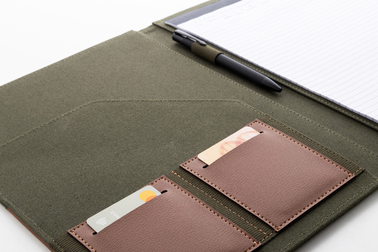 Dokumentenmappe im A4-Format aus recyceltem Canvas und recyceltem PU-Leder mit mehreren Organizer-Fächern vorne und innen. Inklusive liniertem Notizblock mit 20 Seiten aus Recyclingpapier. 70 % recycelte Baumwolle und 30 % RPET-Polyester.
