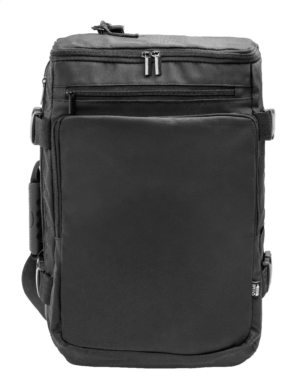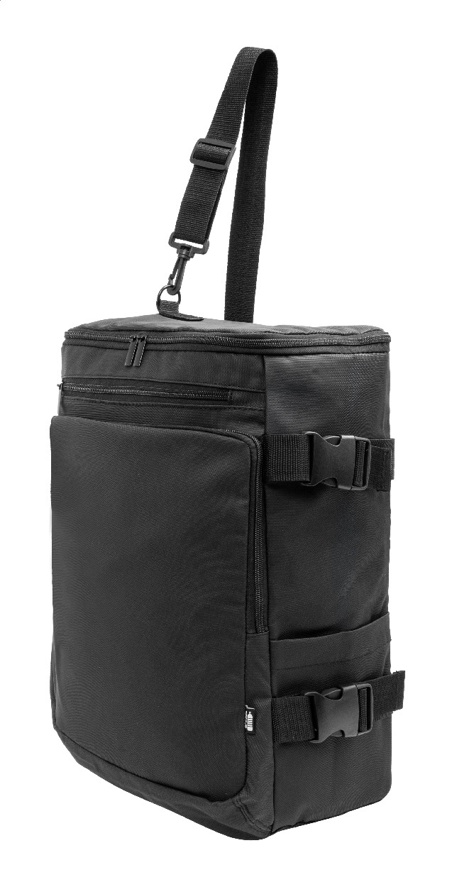 Wasserfester, zweifach nutzbarer RPET-Rucksack und Dokumententasche mit Reißverschluss-Hauptfach, zwei vordere Reißverschlusstaschen, Seitentasche, seitlicher Schnallenriemen und gepolstertem Laptopfach (15"). Mit gepolstertem Rücken und abnehmbaren Schultergurten. Inklusive zusätzlichem abnehmbarem Schultergurt zur Nutzung als Dokumententasche. Material: PU-beschichtetes 600D RPET-Polyester. Mit RPET-Label.