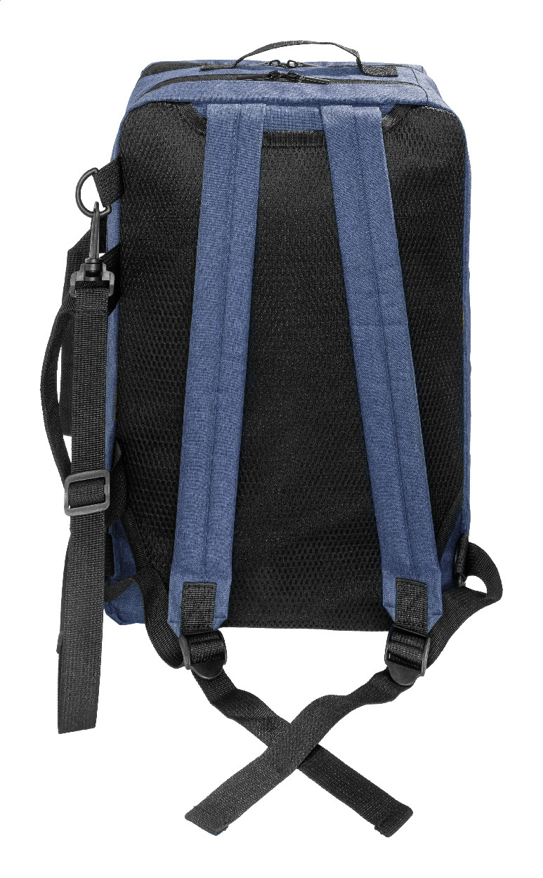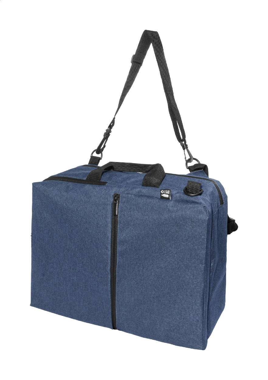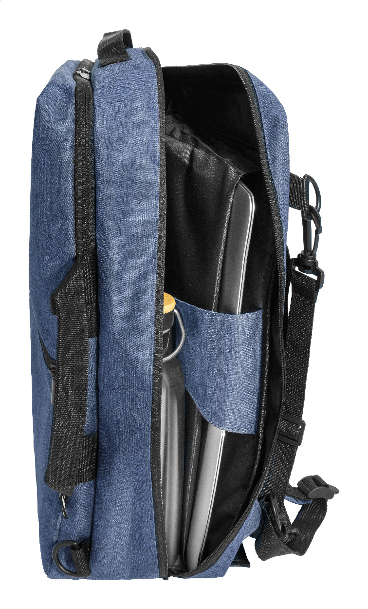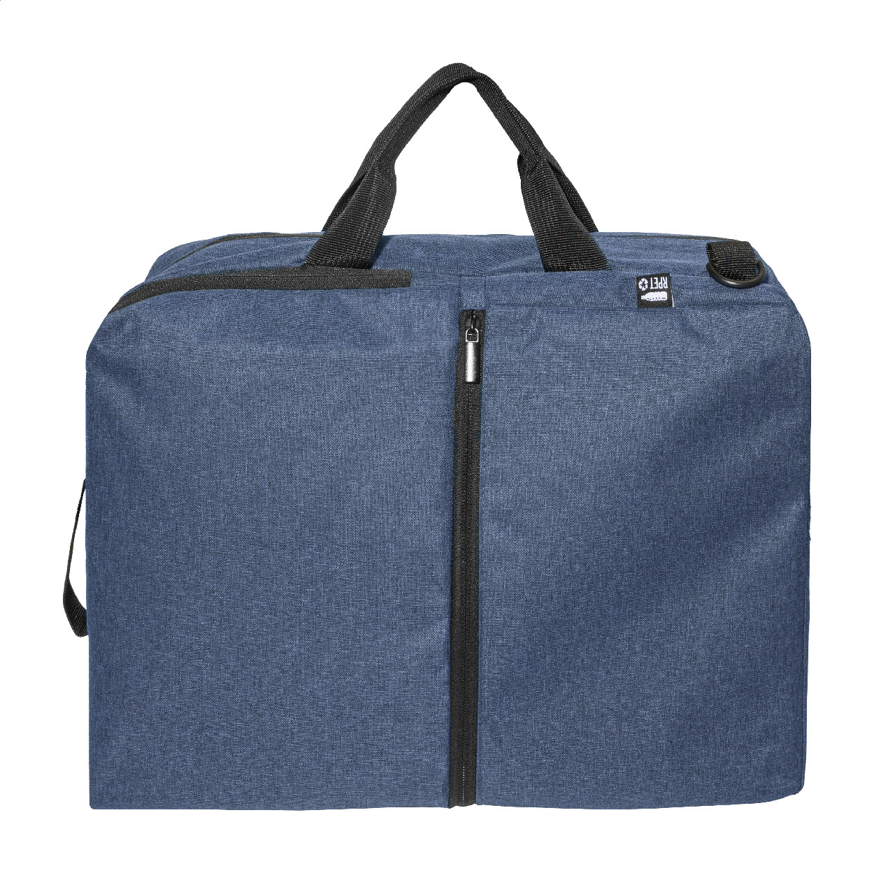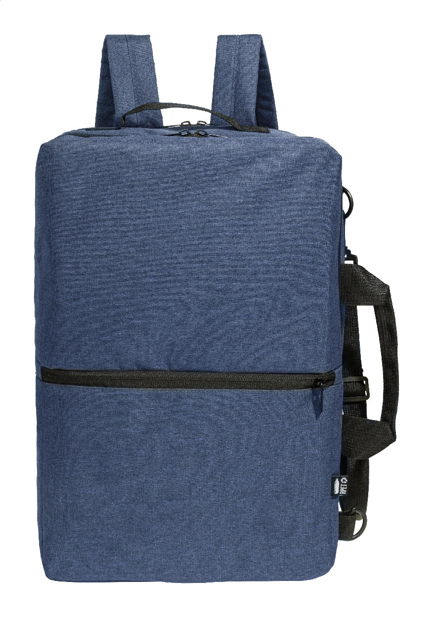 RPET-Rucksack und Dokumententasche mit Doppelfunktion, mit Reißverschlussfach, 2 Reißverschluss-Fronttaschen und gepolstertem Laptopfach (15"). Mit gepolstertem Rücken und Schultergurten. Inklusive zusätzlichem abnehmbaren Schultergurt zur Verwendung als Dokumententasche. Material: 600D RPET-Polyester. Mit RPET-Label.