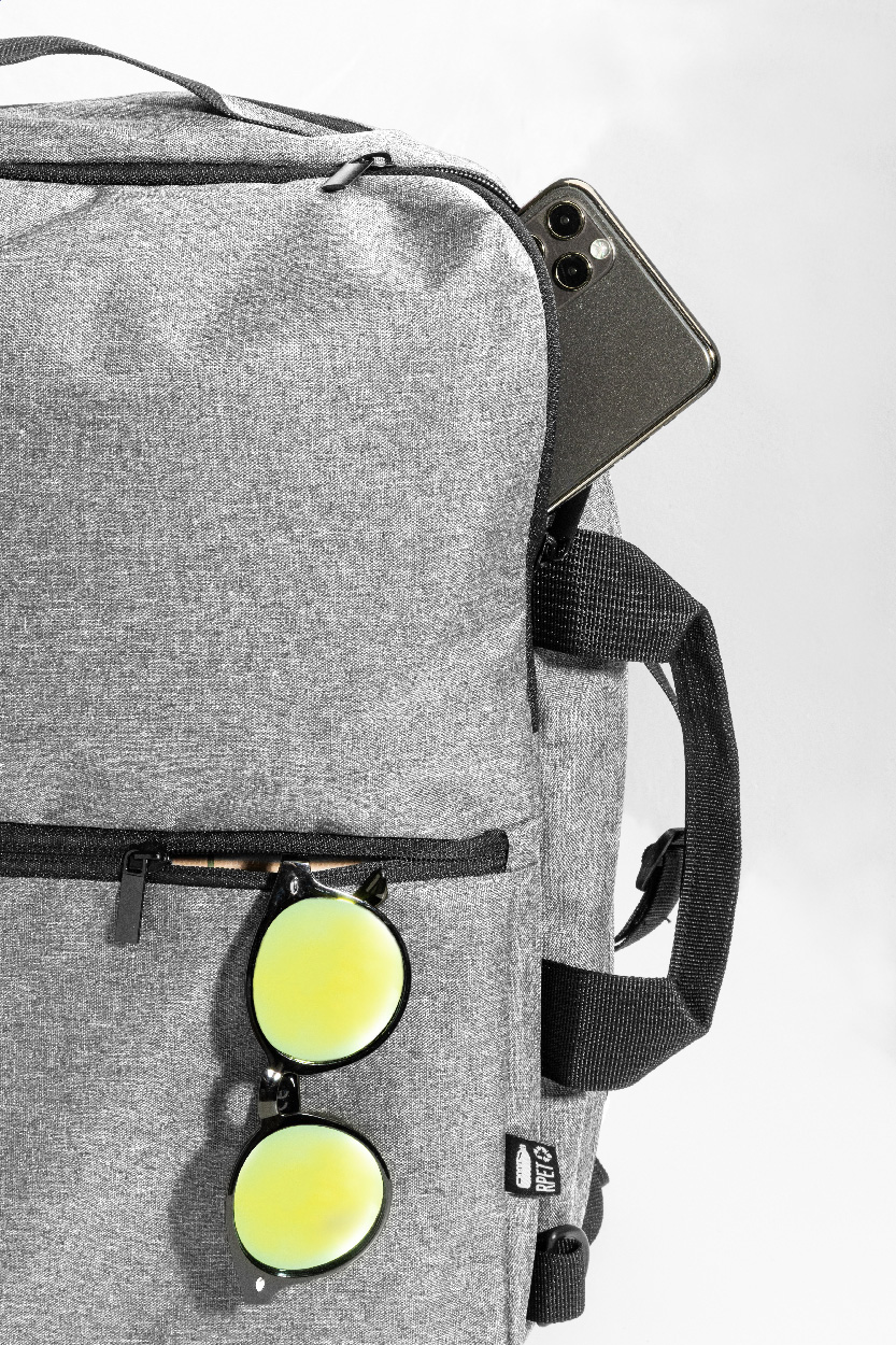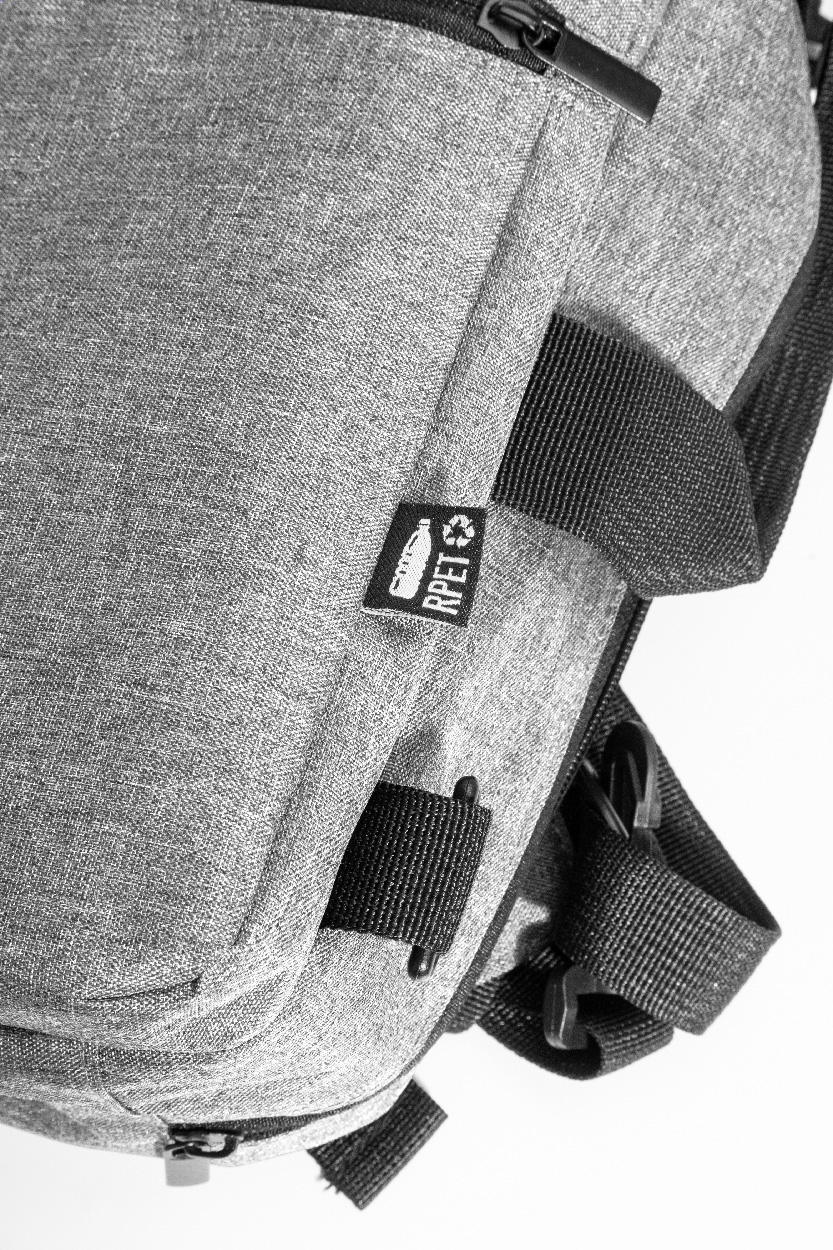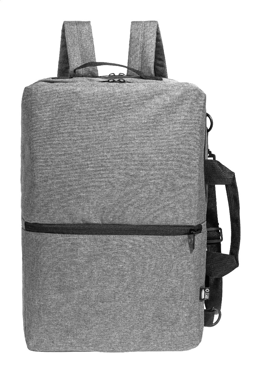 RPET-Rucksack und Dokumententasche mit Doppelfunktion, mit Reißverschlussfach, 2 Reißverschluss-Fronttaschen und gepolstertem Laptopfach (15"). Mit gepolstertem Rücken und Schultergurten. Inklusive zusätzlichem abnehmbaren Schultergurt zur Verwendung als Dokumententasche. Material: 600D RPET-Polyester. Mit RPET-Label.