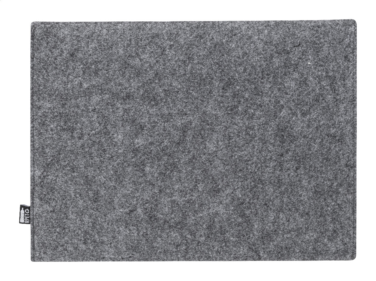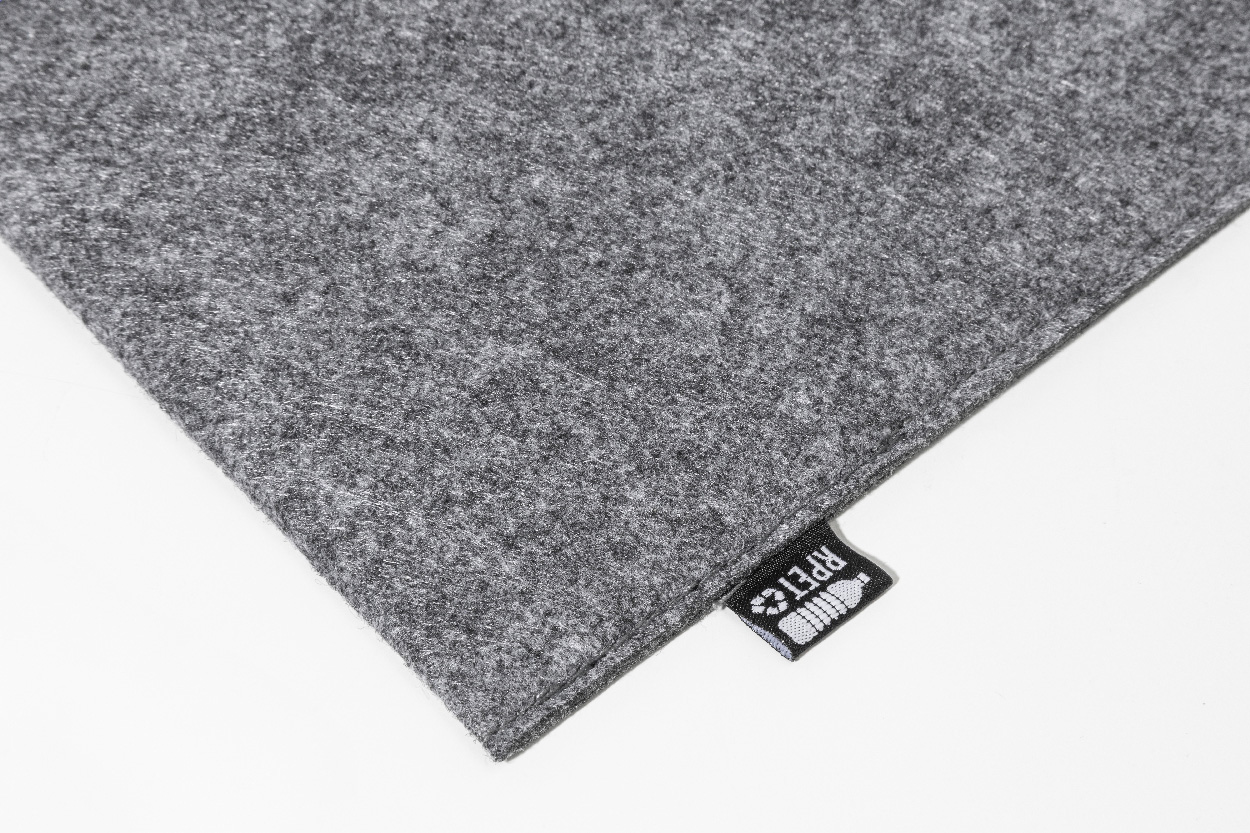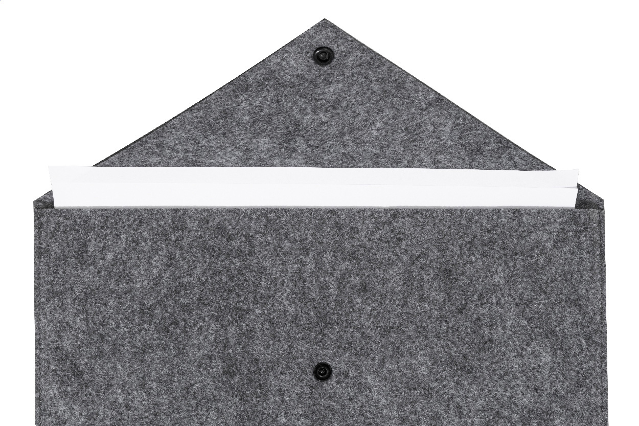 Dokumenten- oder Laptoptasche aus RPET-Filz mit Druckknopfverschluss. Passend für Laptops bis 13 Zoll. Mit RPET-Label.