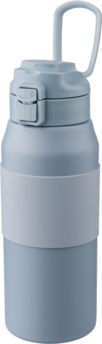 Doppelwandige Edelstahl-Trinkflasche (800 ml) mit Silikongriff, Strohhalm, PP-Deckel und Tragegriff. Hergestellt aus rostfreiem Edelstahl 304. Druckknopf zum Öffnen und Schließen des Ausgusses. Hält den Inhalt 8 Stunden lang heiß und 12 Stunden lang kalt. Einzeln verpackt in einer braunen Pappschachtel.