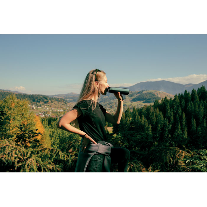 Doppelwandige Isolierflasche aus recyceltem Edelstahl (90 % recycelter Edelstahl und 10 % Edelstahl) mit integrierter Kordel im PP-Deckel. Auslaufsicher. Füllmenge: 500 ml.