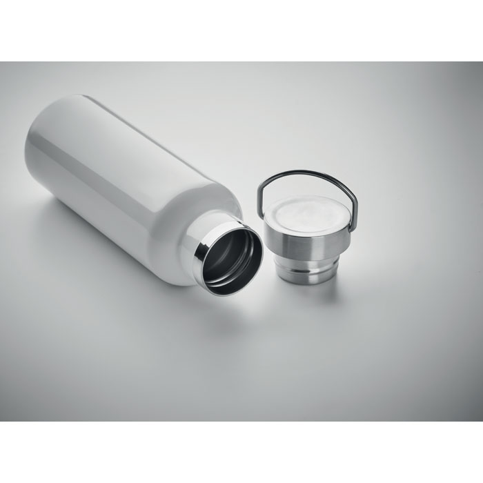 Doppelwandige Isolierflasche aus recyceltem Edelstahl (90 % recycelter Edelstahl und 10 % Edelstahl). Verschluss mit Henkel. Füllmenge: 500 ml.
