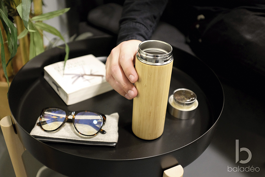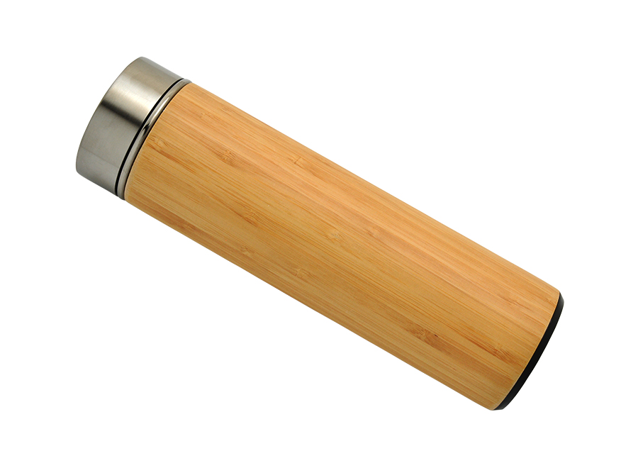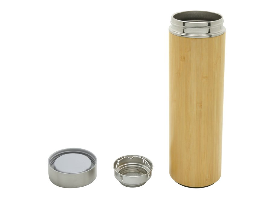 Doppelwandige Thermoflasche aus 18/8 Edelstahl für den Lebensmittelgebrauch. Bambusbeschichtung. Verschraubter Deckel mit Silikondichtung für perfekte Abdichtung. Inklusive Teefilter. Fassungsvermögen: 480 ml. Die Vorteile in Kürze: - Doppelwandiger Edelstahl 18/8 für die Warm- oder Kalthaltung Ihrer Getränke. - Silikondichtung für perfekte Abdichtung. - Integrierter Teefilter. - Elegante Bambusoberfläche.