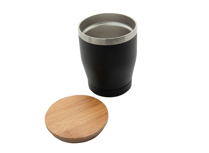 Doppelwandiger Isolierbecher aus rostfreiem Edelstahl 18/8. Deckel aus Bambus mit Silikondichtung. Fassungsvermögen: 330 ml. Warnung: Dieser Artikel ist nicht für die Verwendung in der Mikrowelle geeignet, und der Deckel ist nicht spülmaschinengeeignet. Die Vorteile in Kürze: - Bambusdeckel für Eleganz und bessere Wärmeisolierung Ihrer heißen Getränke. - Pulverbeschichtung für eine verbesserte Optik und Griffigkeit.