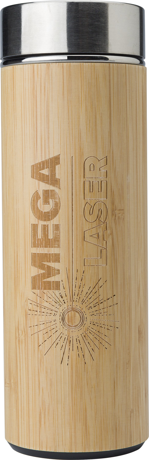 Doppelwandiger Isolierbecher 'Ningbo' (420 ml), innen aus Edelstahl und außen aus Bambus. Der Becher wird mit einem Teesieb geliefert.