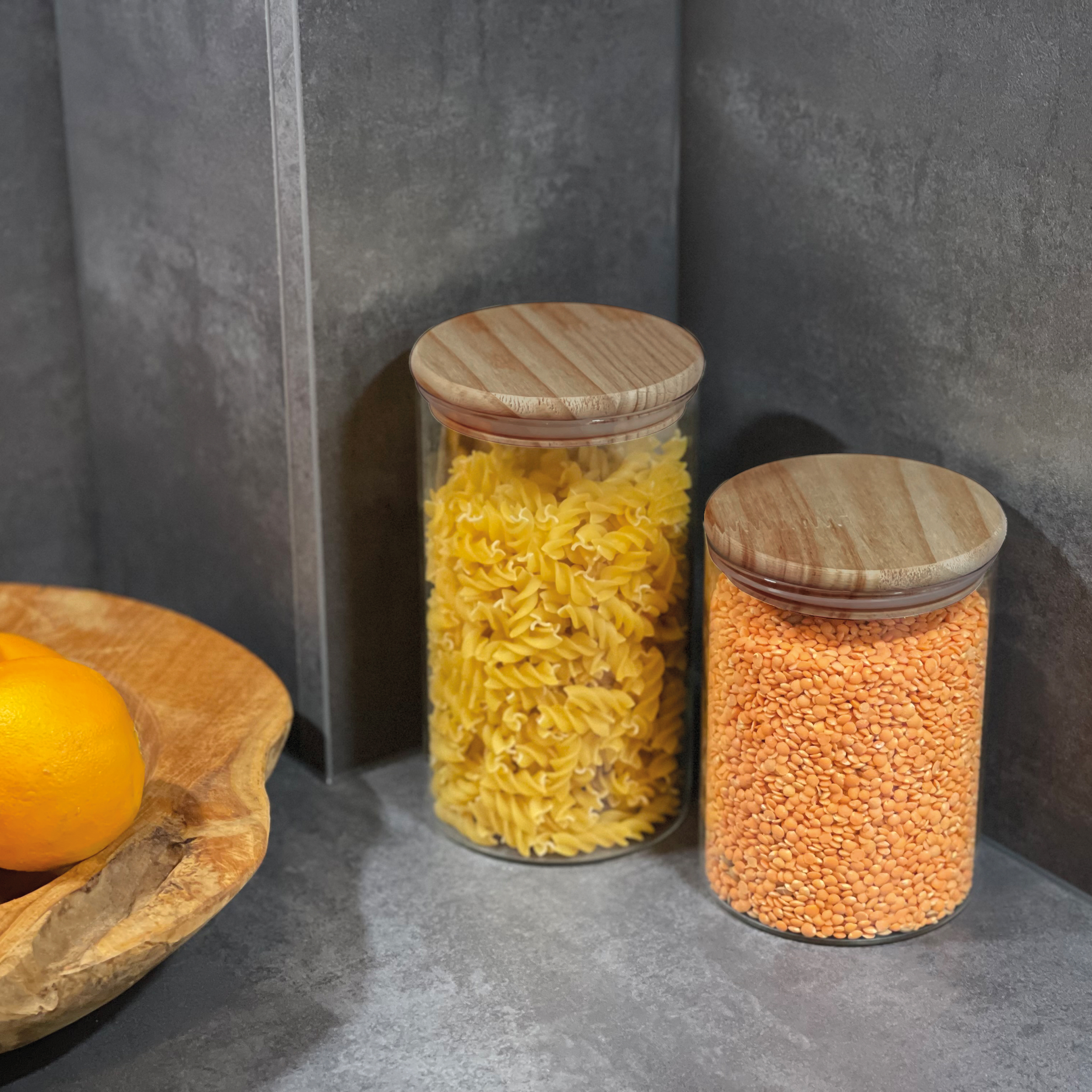 Vorratsdose aus Borosilikatglas mit Bambusdeckel und Silikonring. Mit einem Füllvermögen von 700ml darf dieses Aufbewahrungsglas in keiner Küche fehlen. Ihre Werbung lasern wir auf den Bambusdeckel.