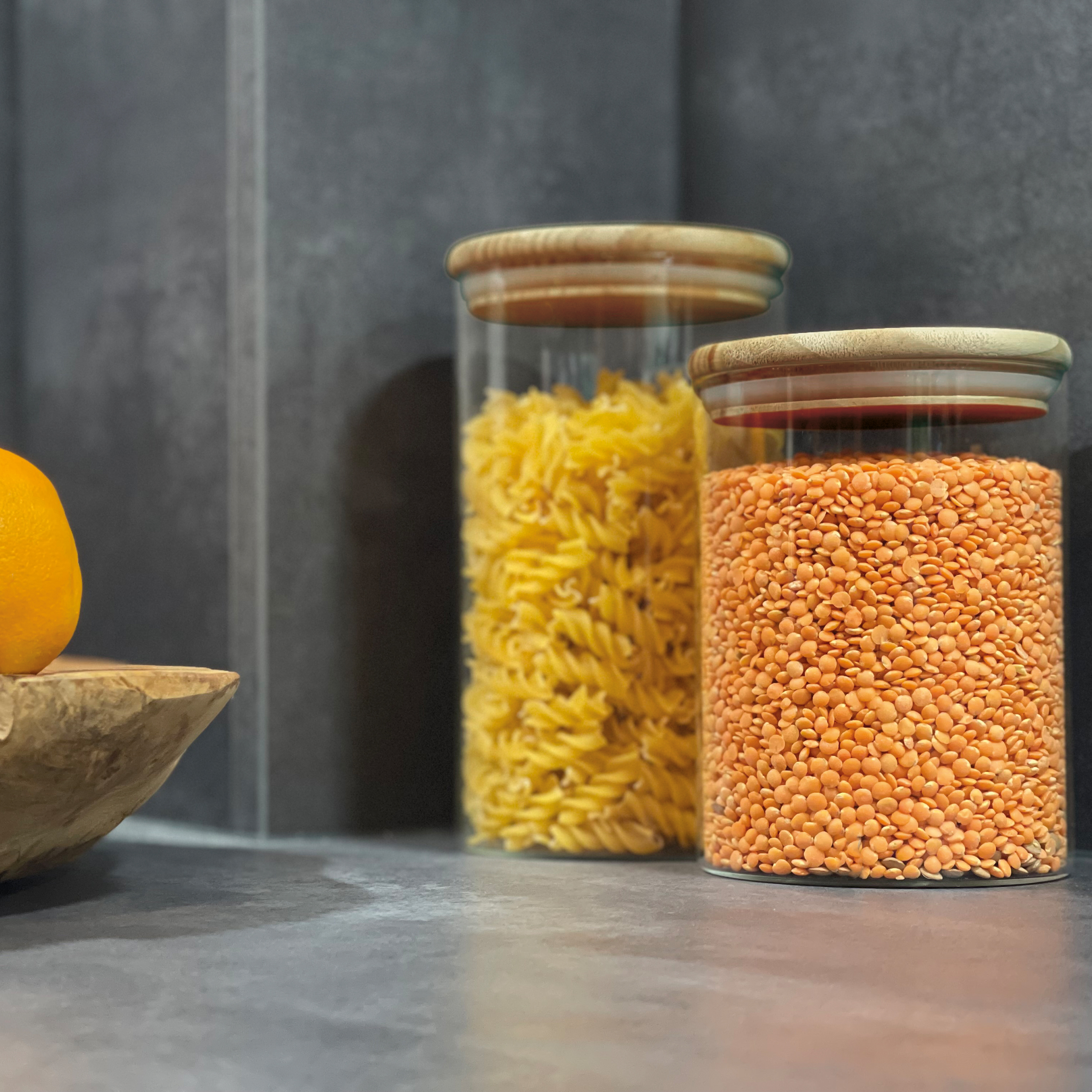 Vorratsdose aus Borosilikatglas mit Holzdeckel und Silikonring. Mit einem Füllvermögen von 1.000ml darf dieses Aufbewahrungsglas in keiner Küche fehlen. Ihre Werbung lasern wir auf den Holzdeckel.