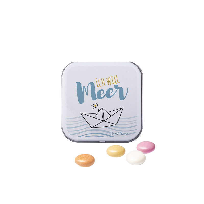 Quadratische weiße Metalldose mit Scharnierdeckel, Weißblech 98% recycelbar, individuell bedruckt. Inhalt: Mentos Kaudragee Fruit (Erdbeere, Orange, Zitrone - gemischt), 20 g.