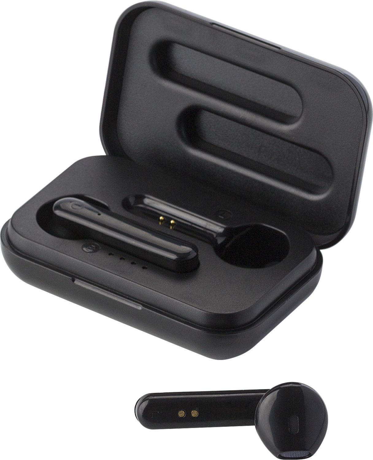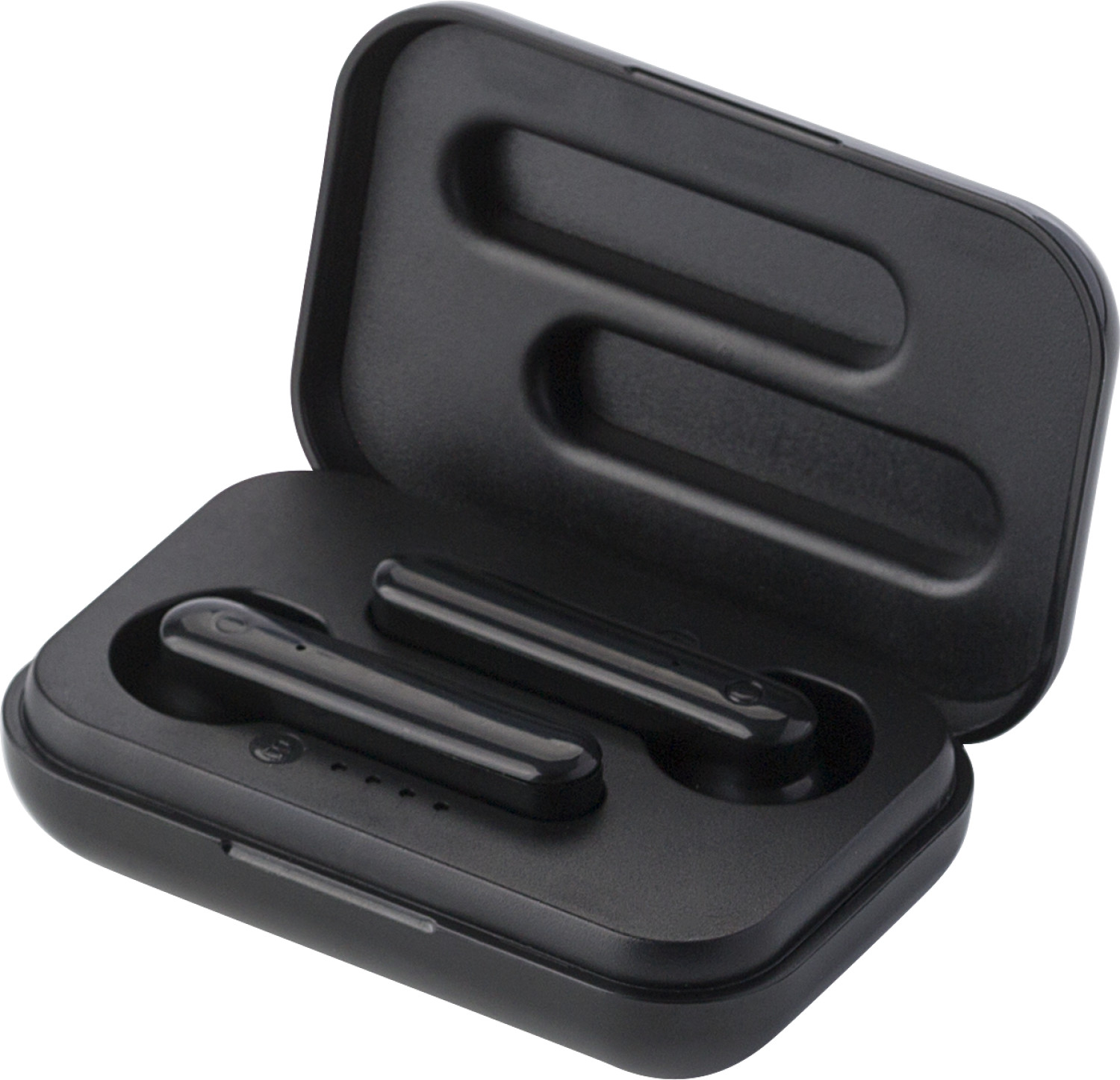 ABS-Kopfhörer mit drahtloser Verbindungstechnologie Version 5.0. Inklusive Ladekabel. Die Ohrhörer sind farblich auf das Gehäuse abgestimmt.