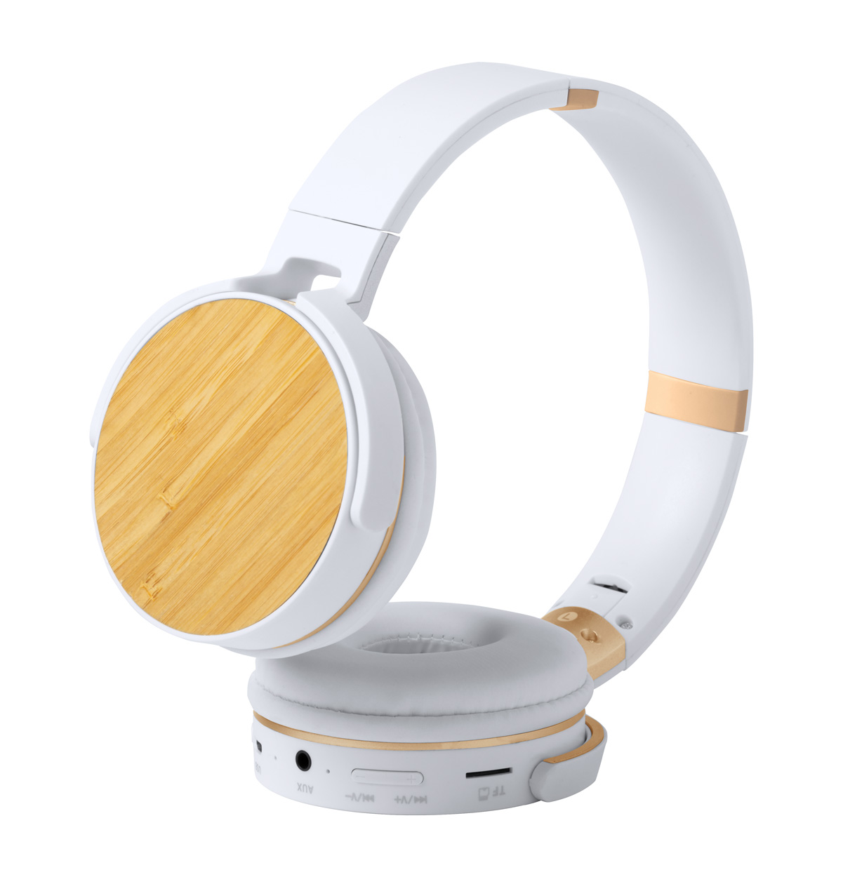 Kabellose Kopfhörer mit Bambusdekor und eingebautem Akku. Mit Freisprechfunktion und Micro-SD-MP3-Wiedergabefunktion. Inklusive 3,5 mm Audio Jack und USB-Ladekabel.