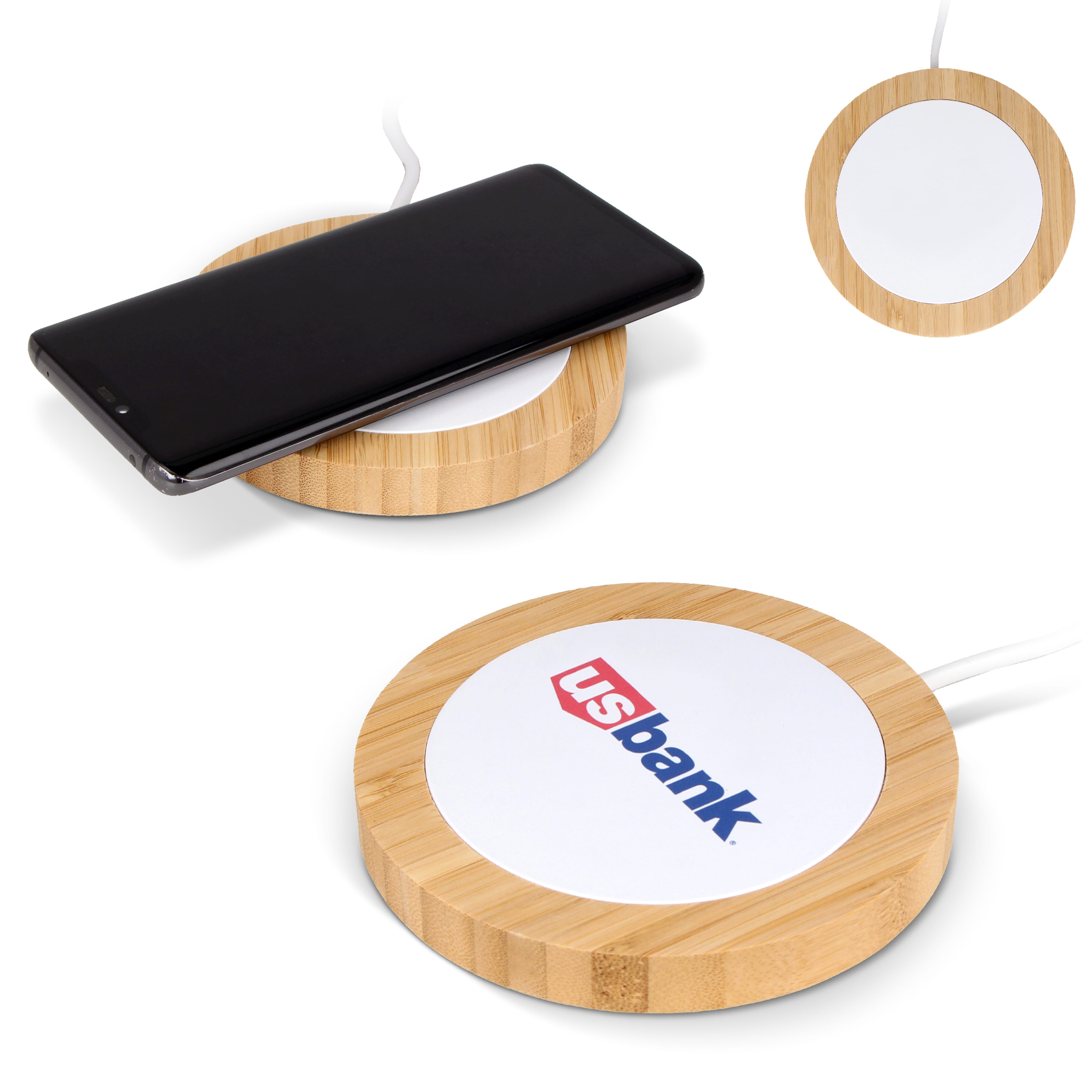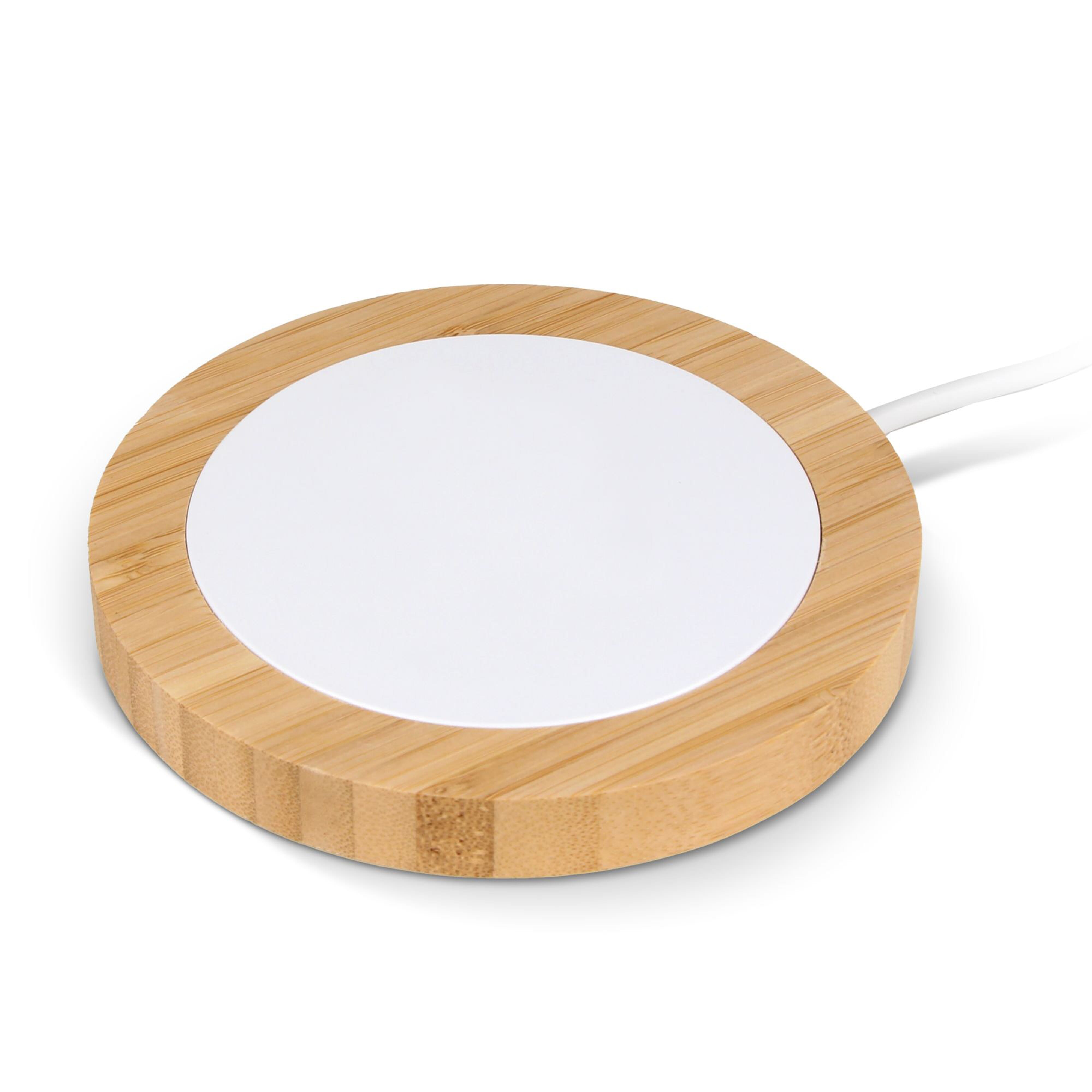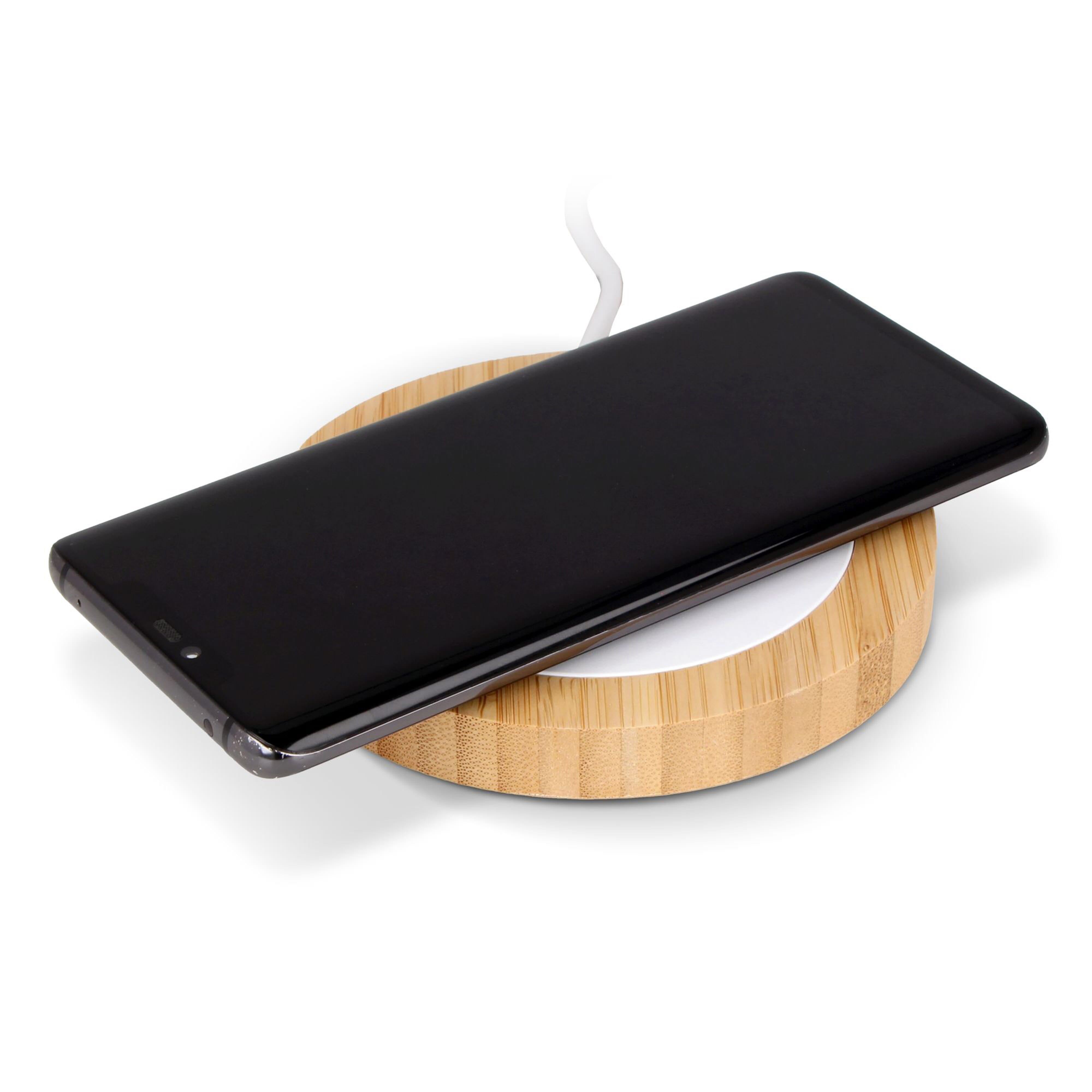 Drahtloses Ladegerät, hergestellt aus Bambus und recyceltem Abs-Material. Kompatibel für Handys, die Qi unterstützen. Leistung: 5W, 7,5W, 10W, 15W. Überhitzungsschutz. Mit großer Druckfläche für Vollfarbaufdruck und 1 Meter Ladekabel. Ideal für Ihr grüneres und nachhaltigeres (Heim-)Büro.