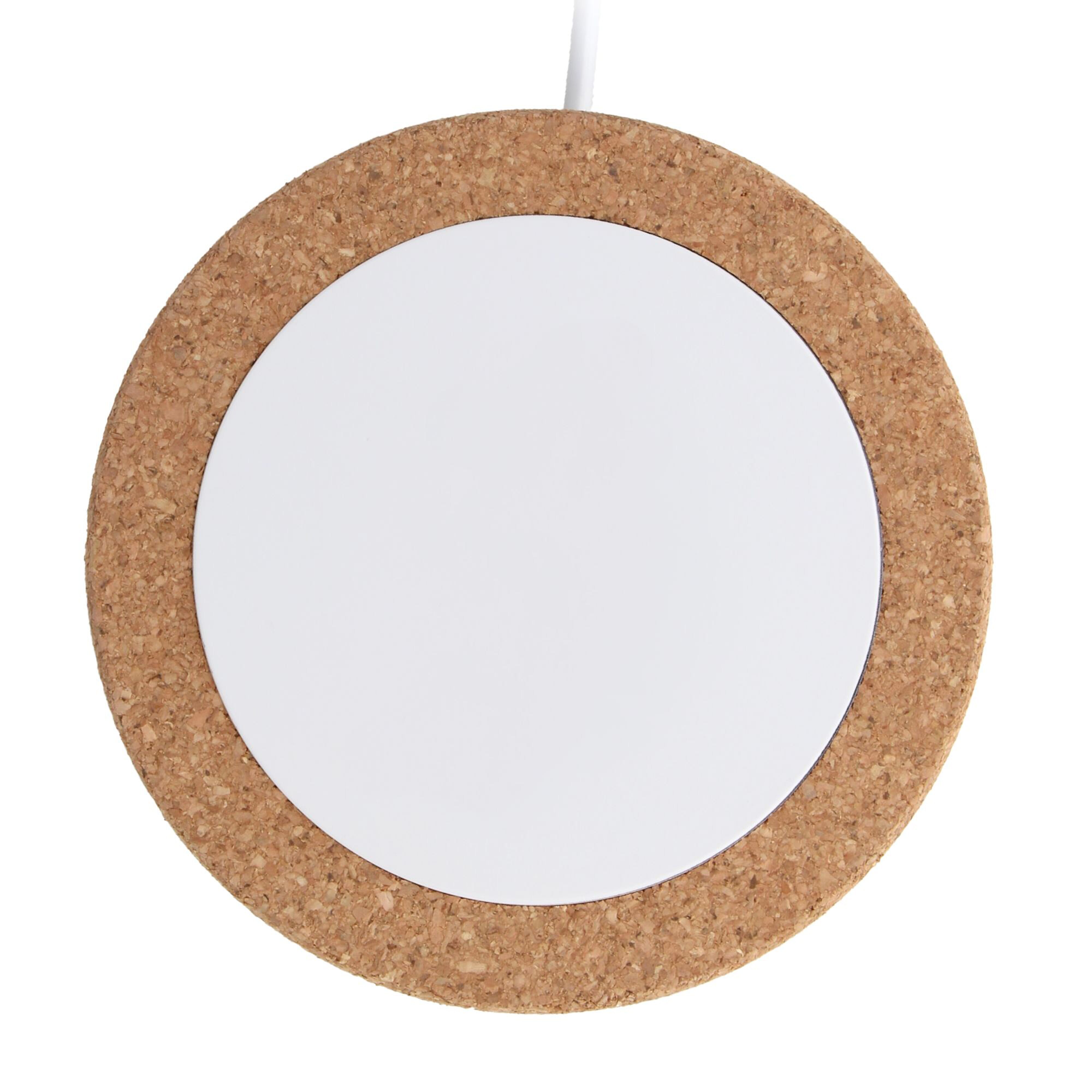 Drahtloses Ladegerät, hergestellt aus Kork und recyceltem Abs-Material. Kompatibel für Handys, die Qi unterstützen. Leistung: 5W, 7,5W, 10W, 15W. Überhitzungsschutz. Mit großem Druckbereich für Vollfarbaufdruck und 1 Meter Ladekabel. Ideal für Ihr grüneres und nachhaltigeres (Heim-)Büro.