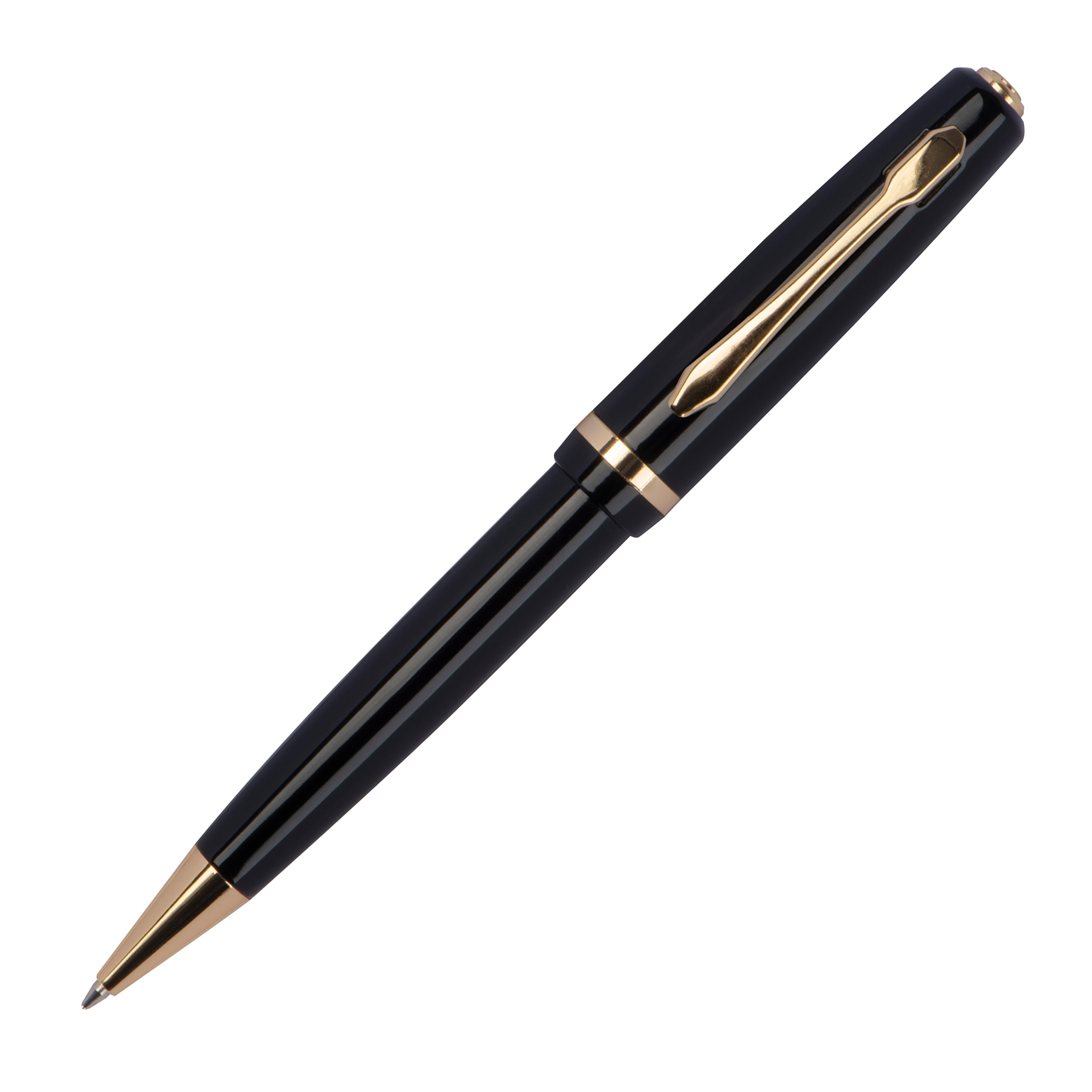 Drehkugelschreiber aus Metall mit goldenen Applikationen und blau schreibender Mine. Ihre Werbung wird rechts vom Clip graviert.