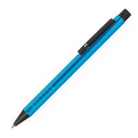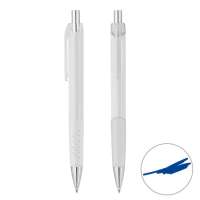 Druckkugelschreiber aus Metall mit blau schreibender Mine und extravaganter Griffzone. Ihre Werbung wird rechts vom Clip per Lasergravur angebracht.