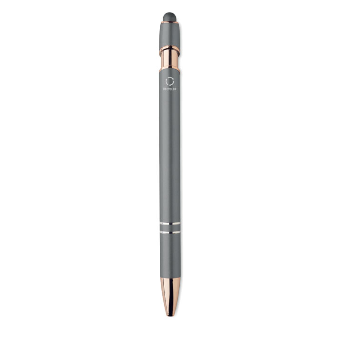Druckkugelschreiber mit Stylus aus recyceltem Aluminium mit rosé goldenen Details. Blaue Tinte.
